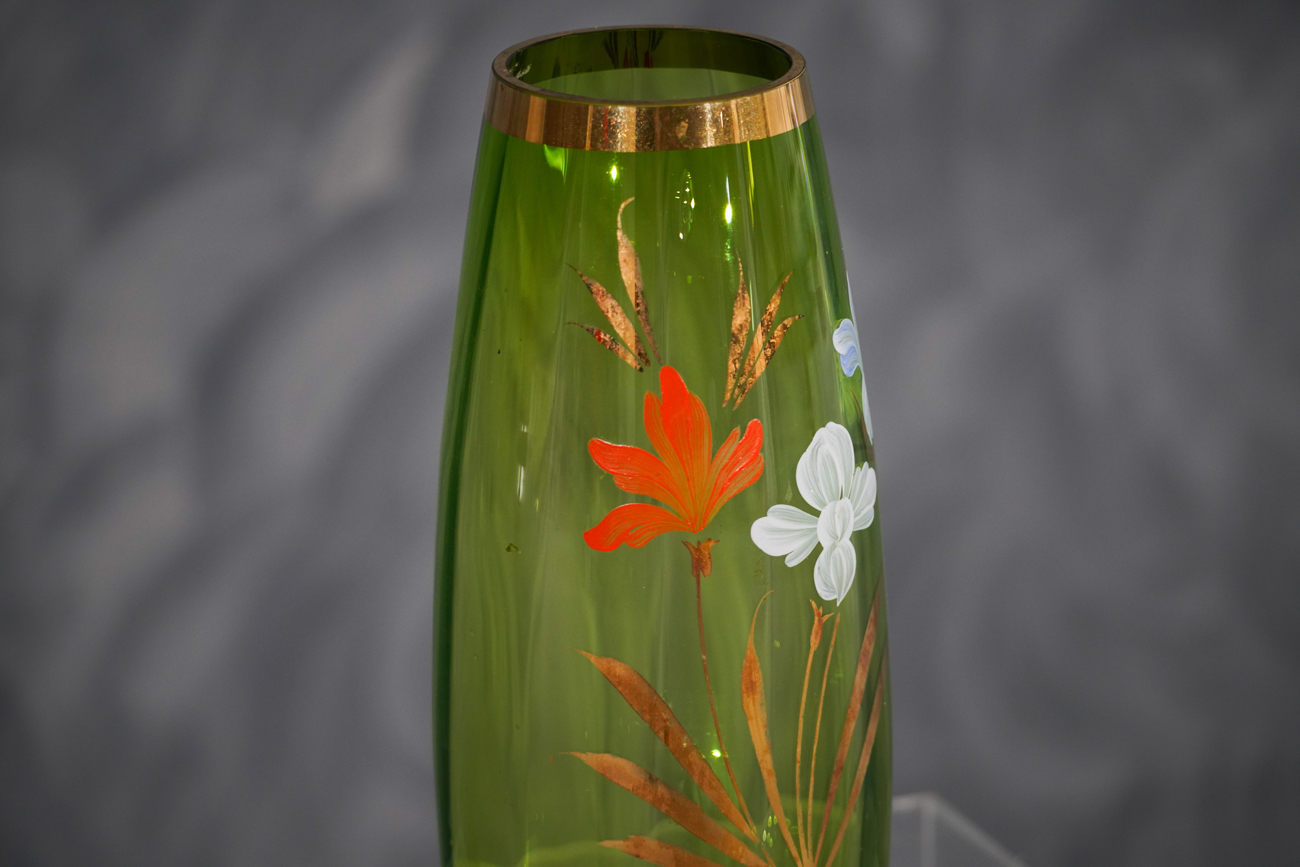 A beautiful vintage emerald green glass vase from Germany, dating to the 1960s. This tall Bohemian-style vase features a ruffled top and delicate hand-painted gold enamel flowers with vine details. The vibrant green glass and fine decorative work give it a timeless, elegant look.