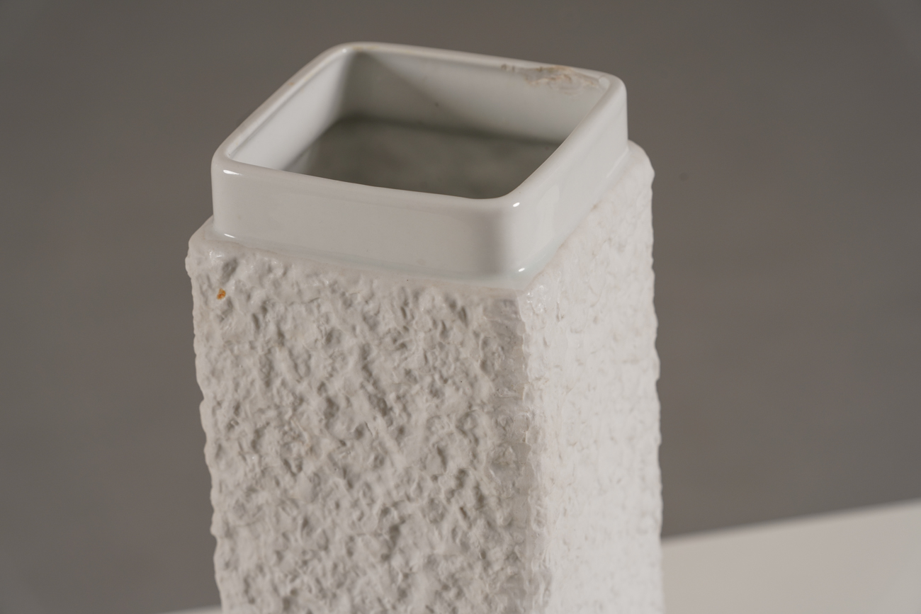These vases are timeless examples of Mid-Century Modern design. They make a beautiful decorative pair for shelves, tables, or mantels and are perfect for collectors or lovers of modernist porcelain.