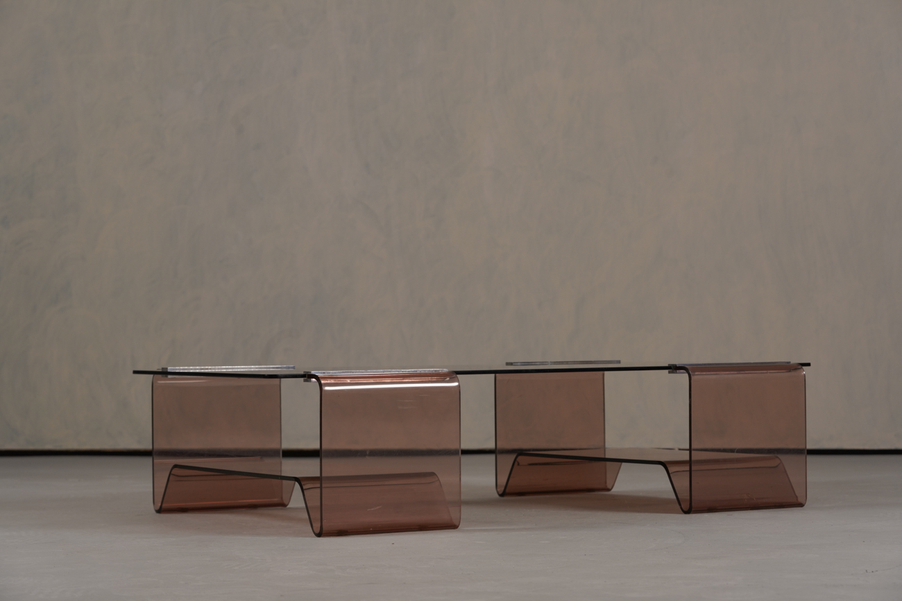 The table features a smoked glass top supported by sculptural plexiglass bases connected with metal elements. Its composition creates a visually light yet architecturally grounded presence, making it both functional and visually striking.