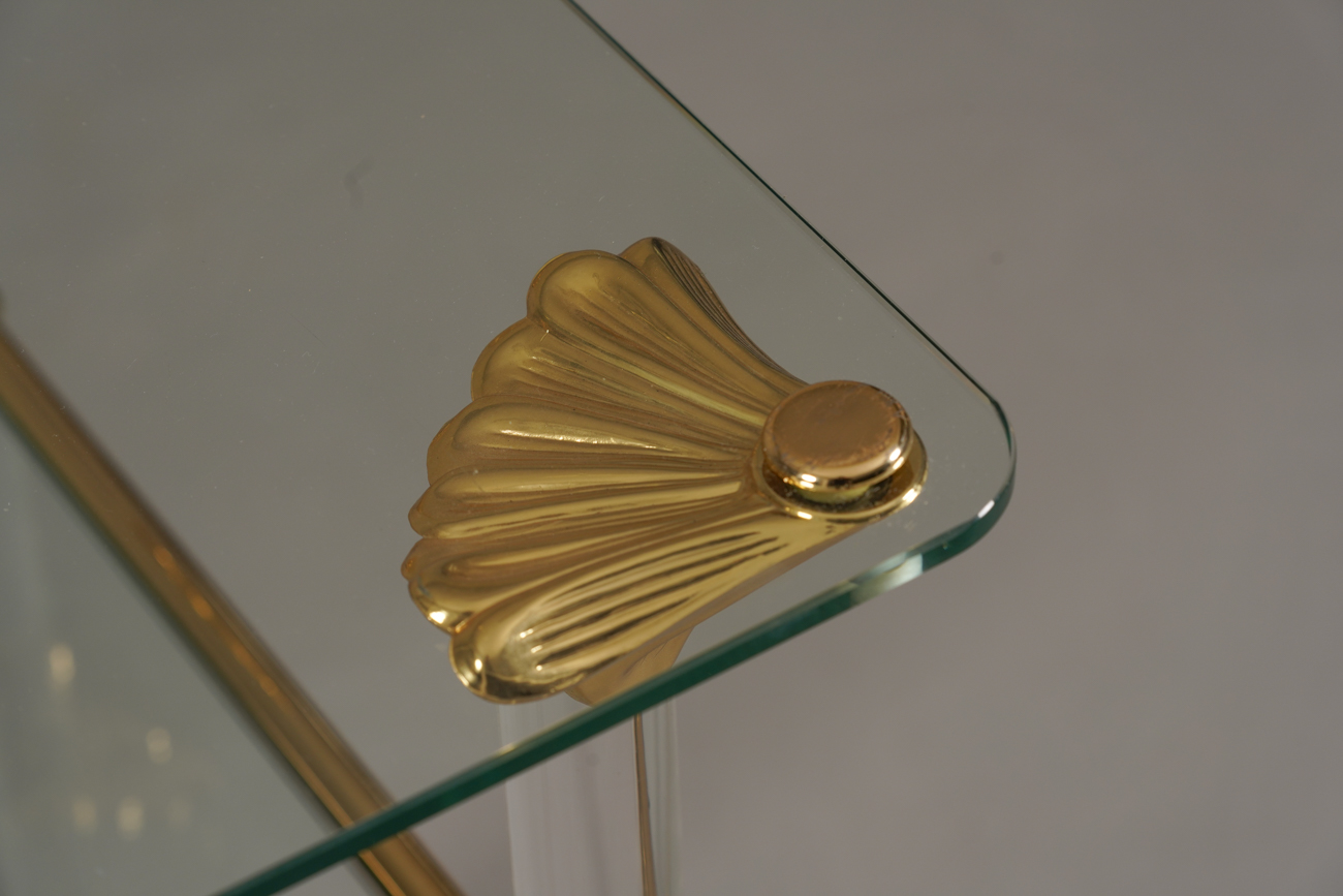 This Mid-Century Modern piece features a brass frame, lucite details, two glass tiers, and a mirrored lower shelf, combining elegance with functionality.