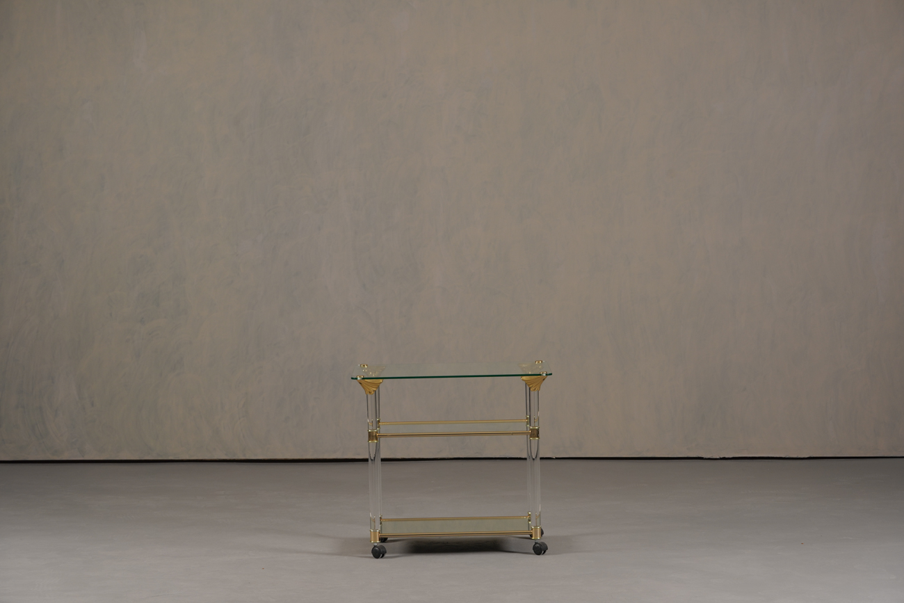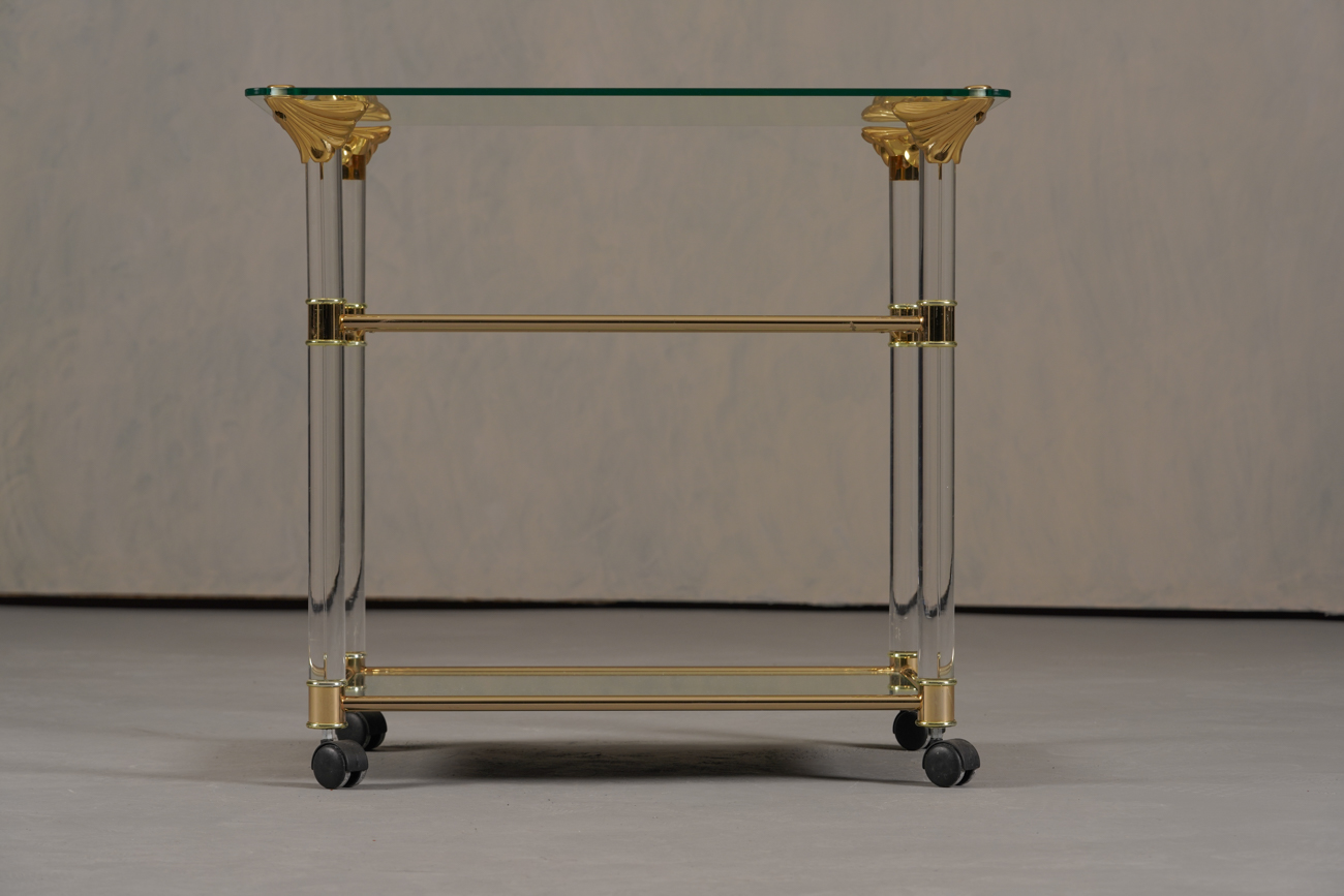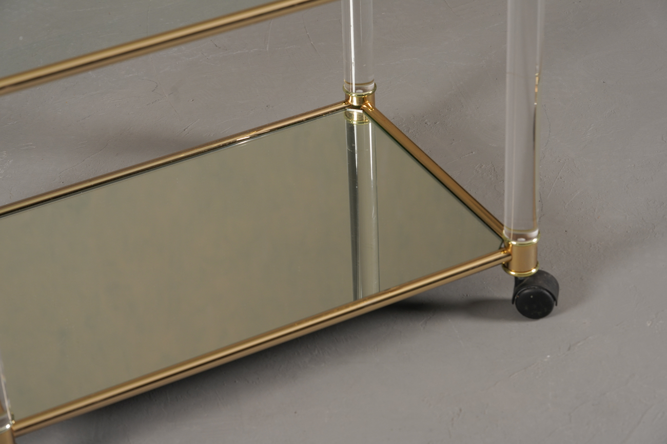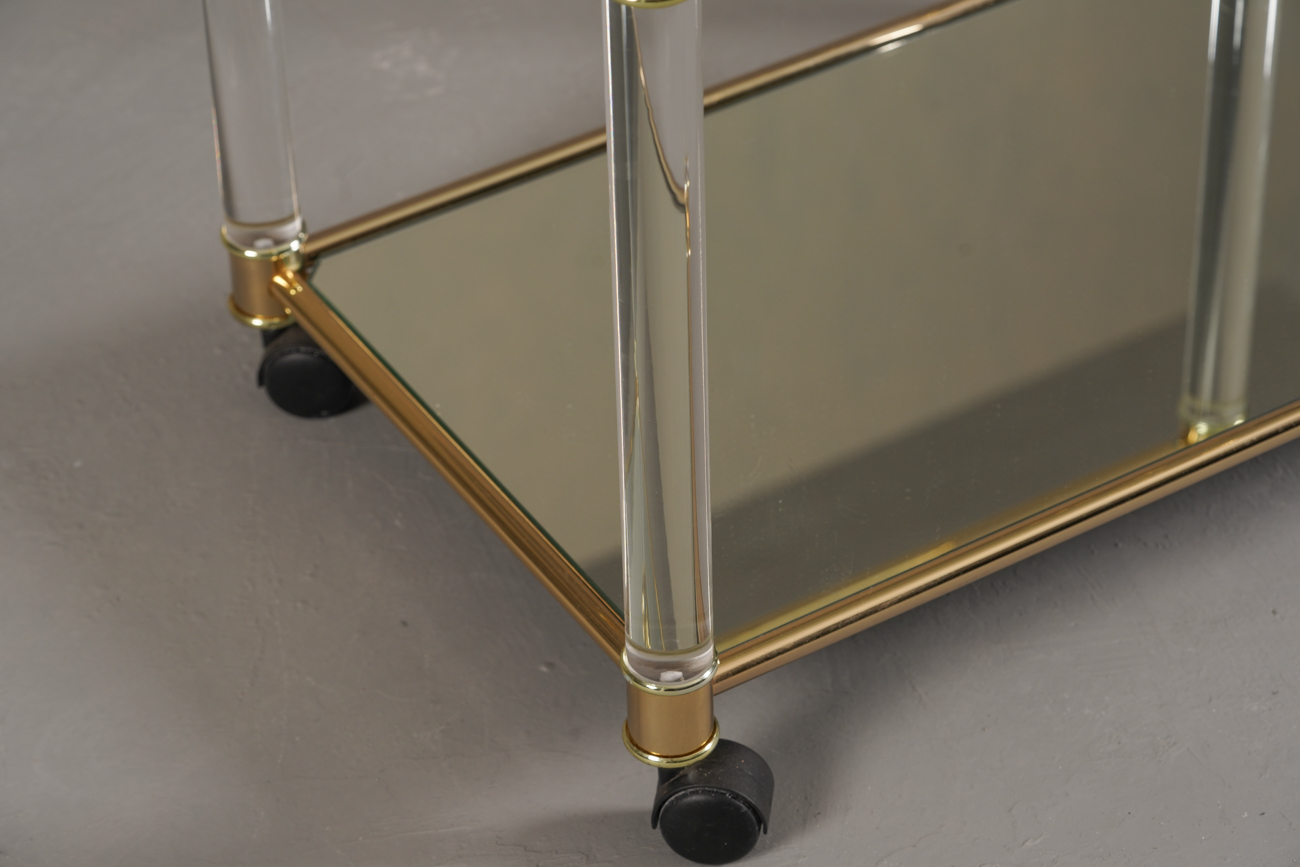 A luxurious vintage brass and lucite serving trolley — perfect for entertaining or as a stylish display piece.