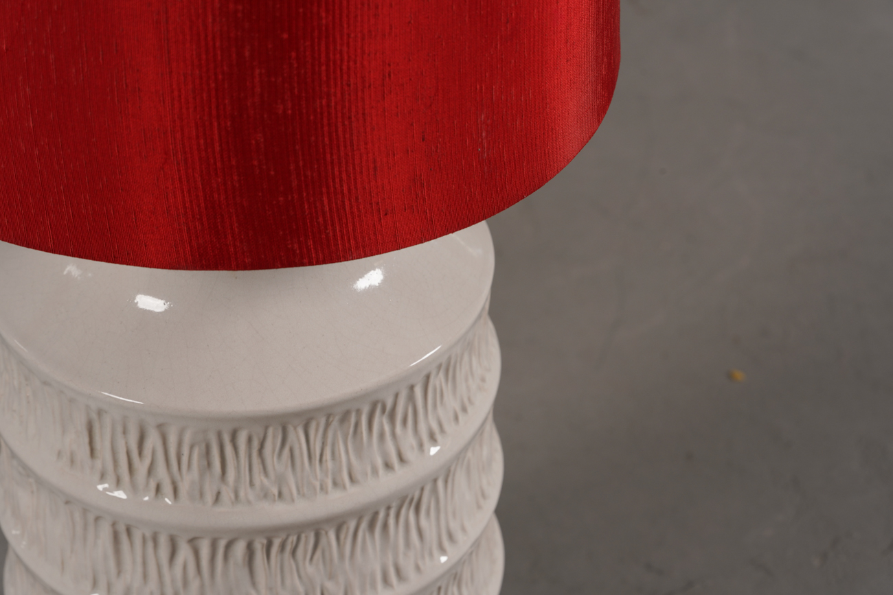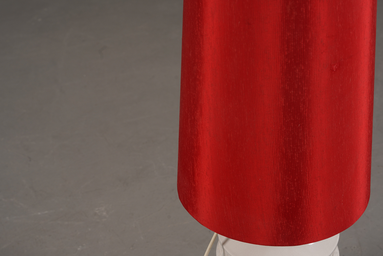 A highly stylised vintage floor lamp by Hustadt from Germany, dating to the 1970’s. This West German pottery lamp features a white glazed ceramic base paired with an elongated conical red lampshade, creating a bold and elegant contrast.