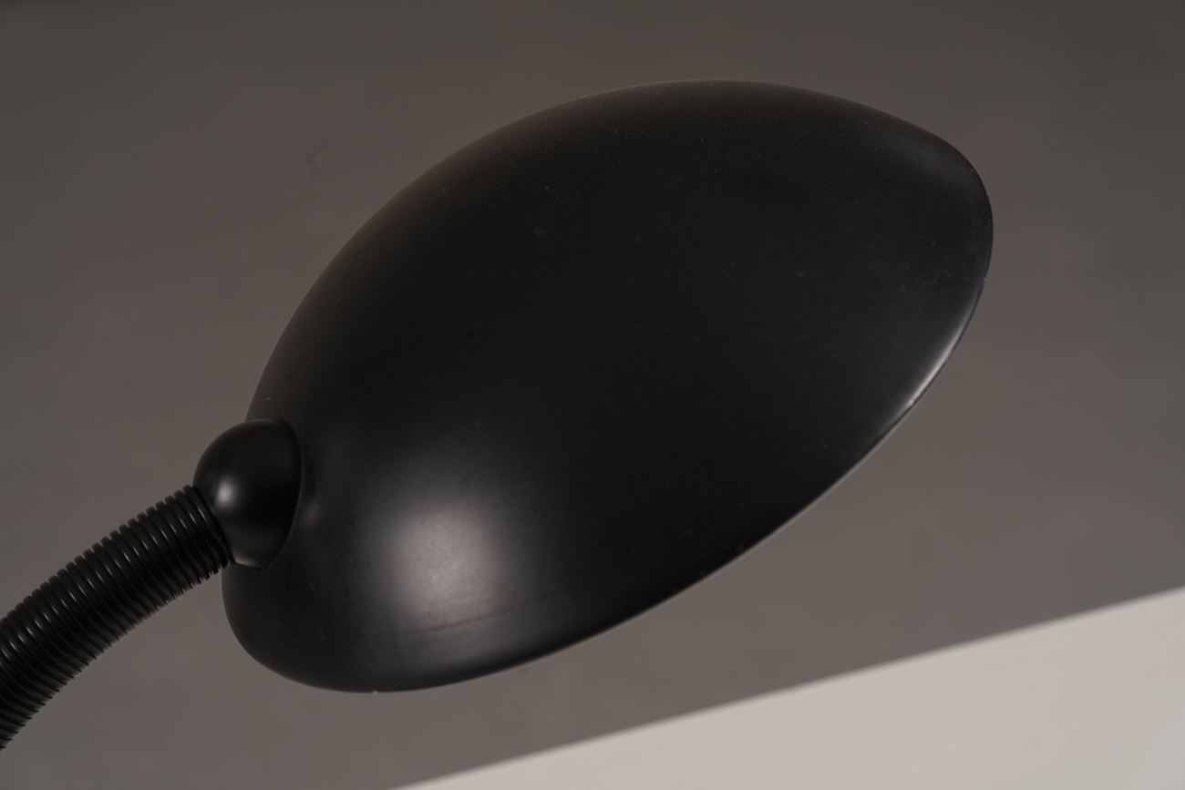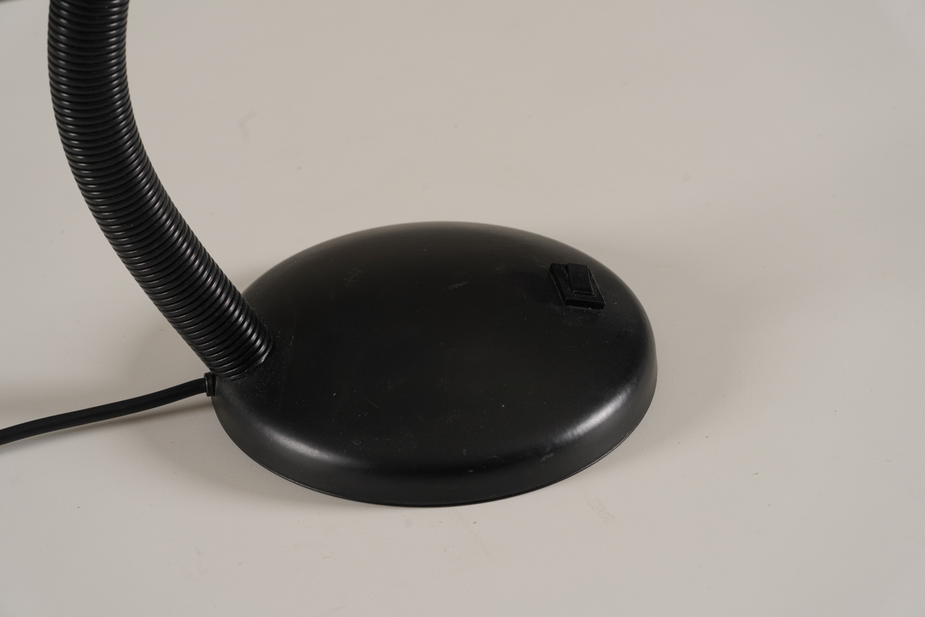 A classic vintage black gooseneck desk lamp from Germany, produced by Hustadt Leuchten in the 1970’s. This Bauhaus-inspired lamp features a flexible metal neck and a sleek black metal shade, combined with durable plastic elements for functionality.