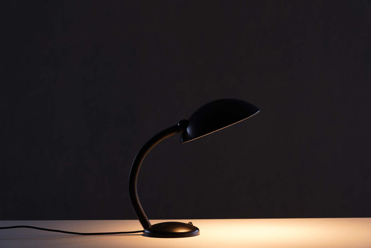 A vintage black gooseneck desk lamp — stylish, functional, and perfect for Mid-Century Modern interiors.