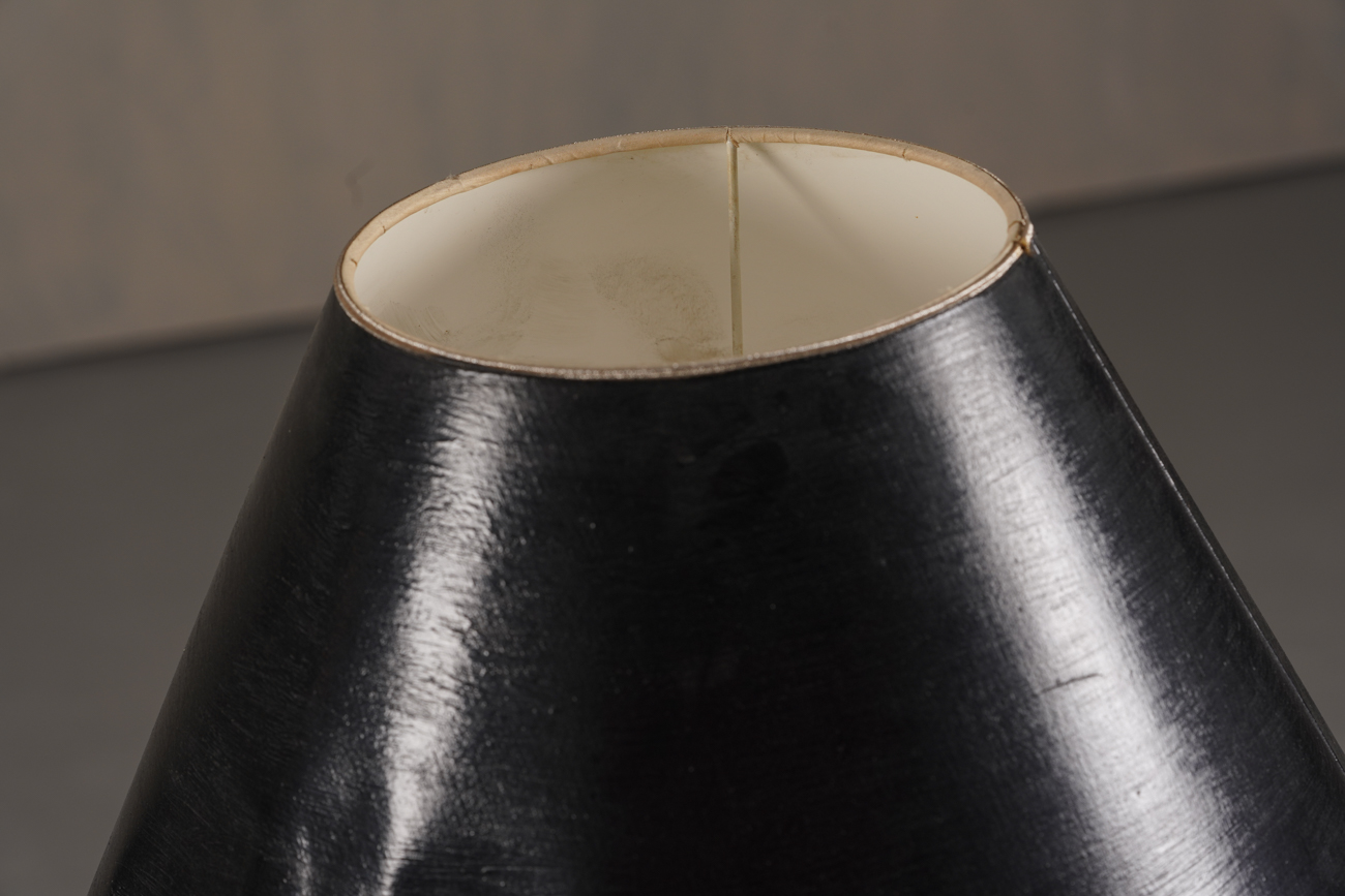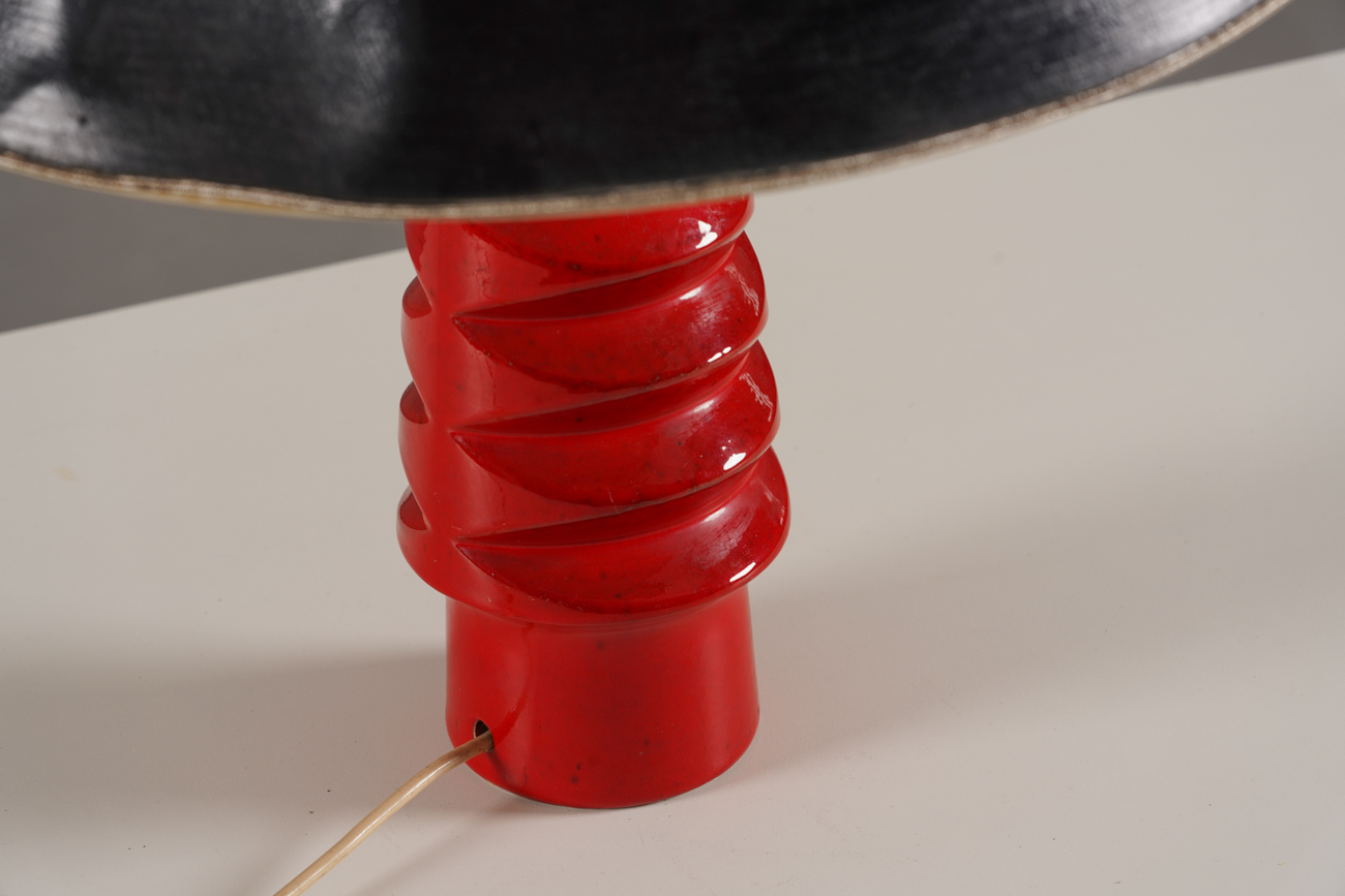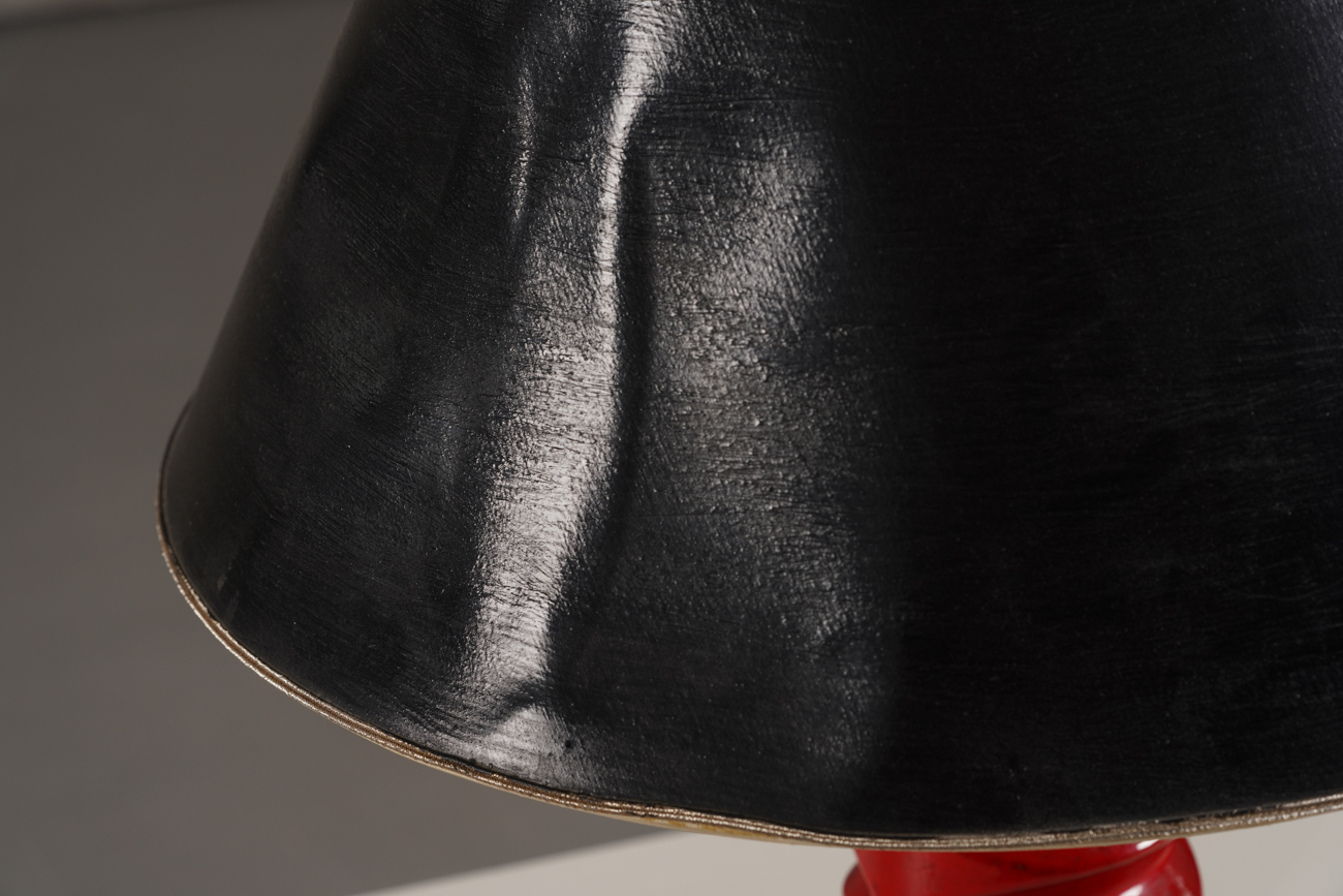 This lamp features a red and black ceramic base with a hat-shaped design, topped with a classic fabric shade. Its bold colors and sculptural form bring artistic charm to any interior.