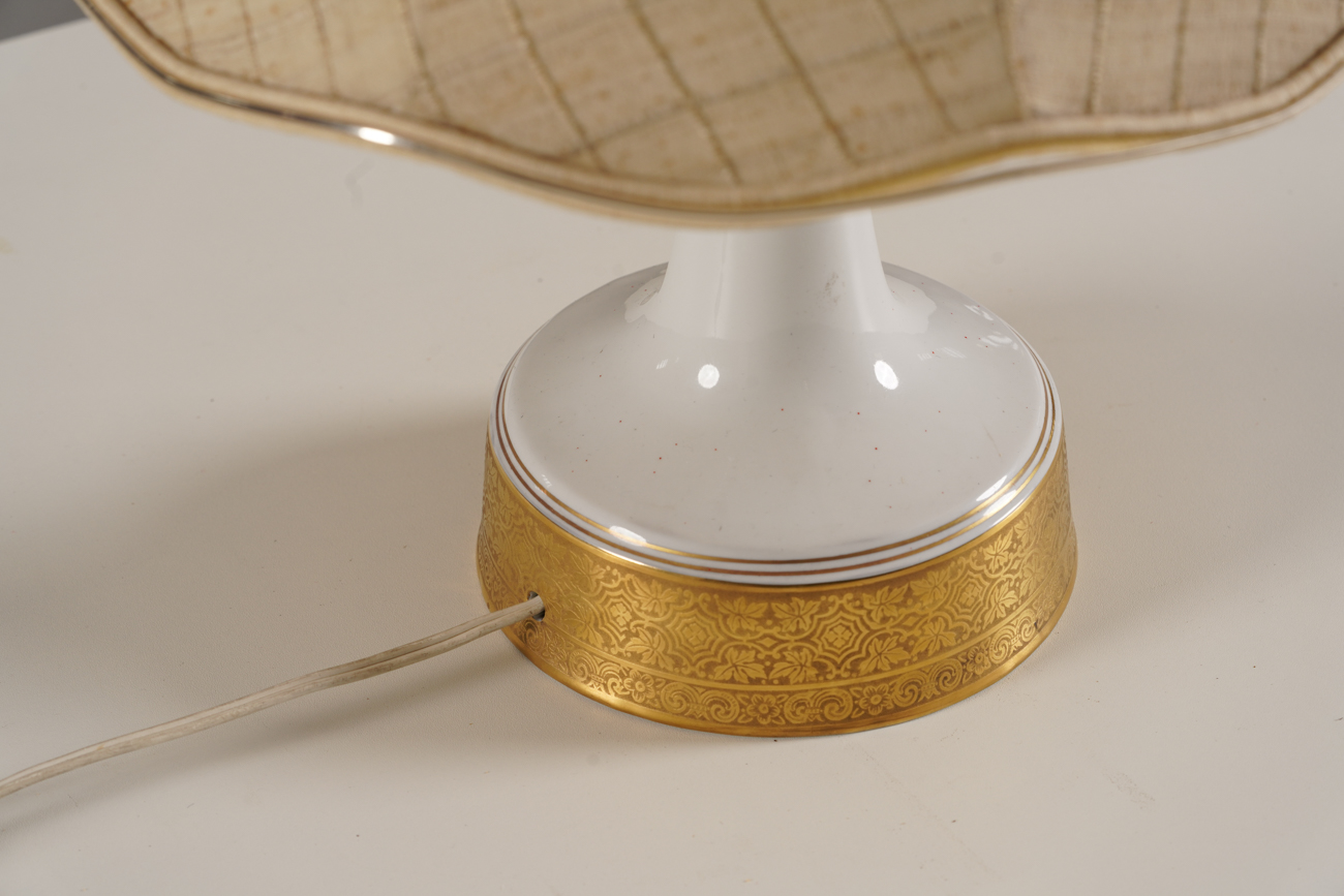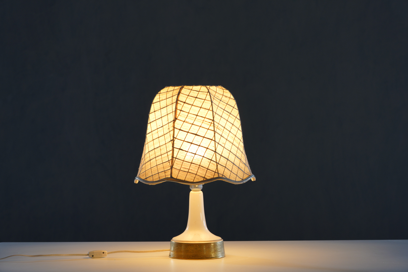 A charming vintage table lamp from Germany, 1960’s. The lamp features a white ceramic base with elegant gold inlays, paired with a classic fabric shade. Its design reflects Mid-Century Modern and Hollywood Regency influences, combining style and warmth.