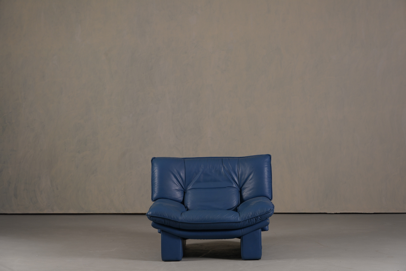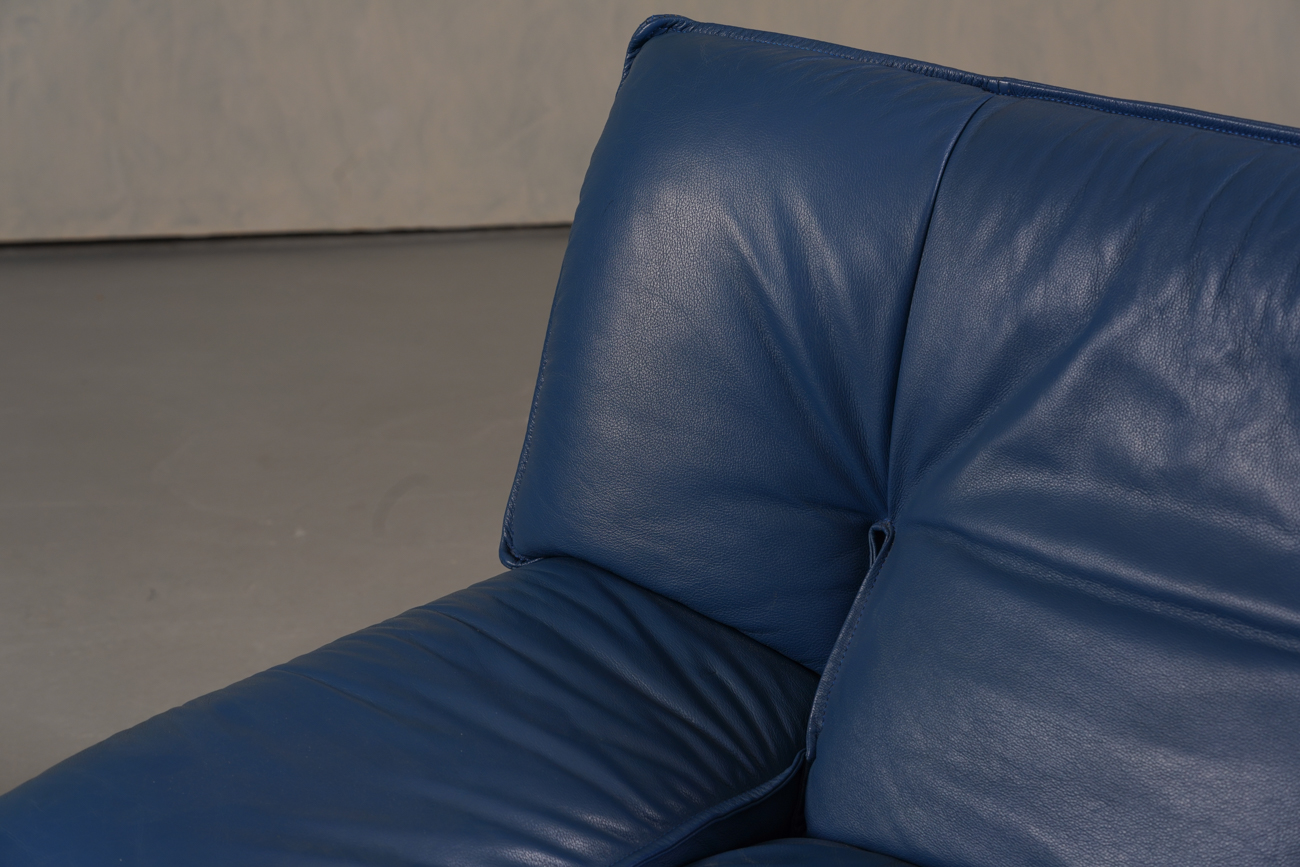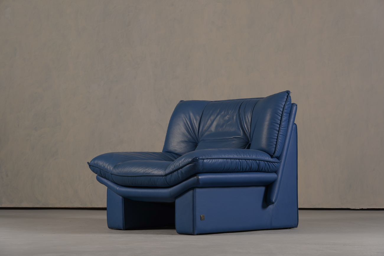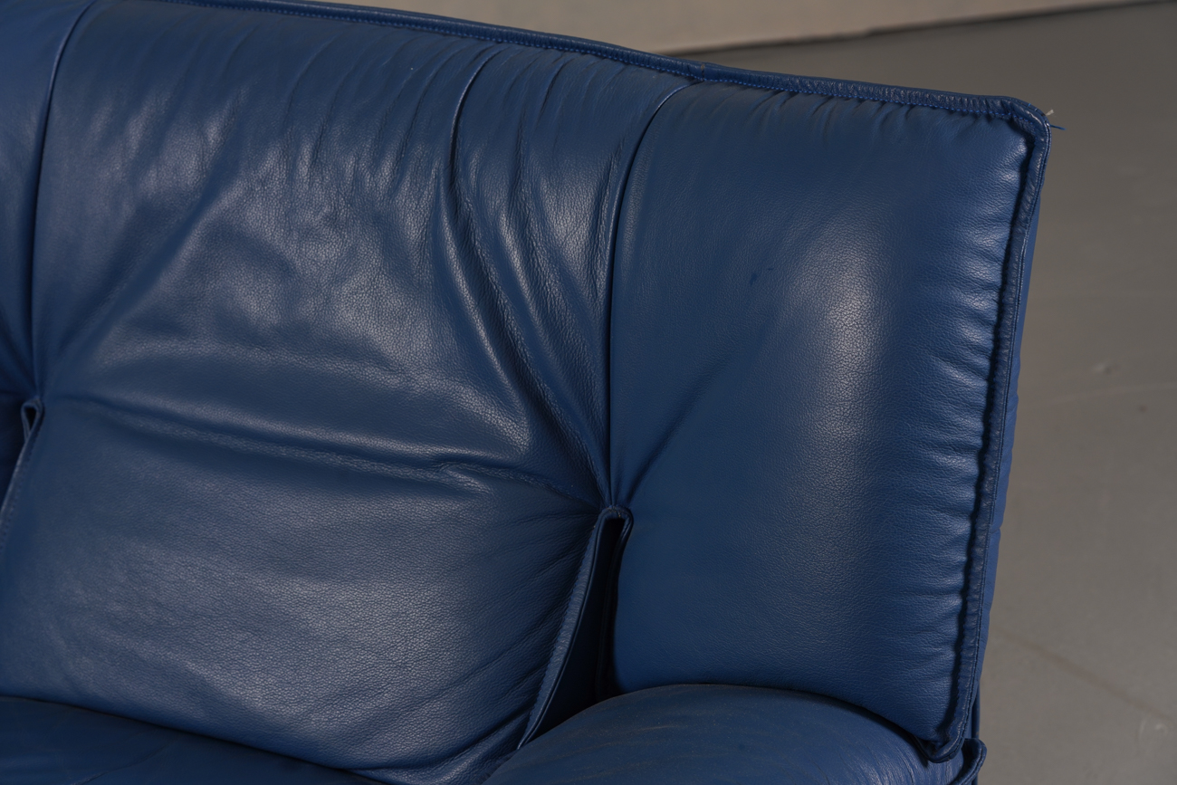 The set features a blue leather sofa and armchair, both offering wide, comfortable seating. Unique back supports and legs upholstered in thick, soft leather give the pieces character. Inspired by pop-art aesthetics, this set adds a sophisticated and lively presence to any interior.
