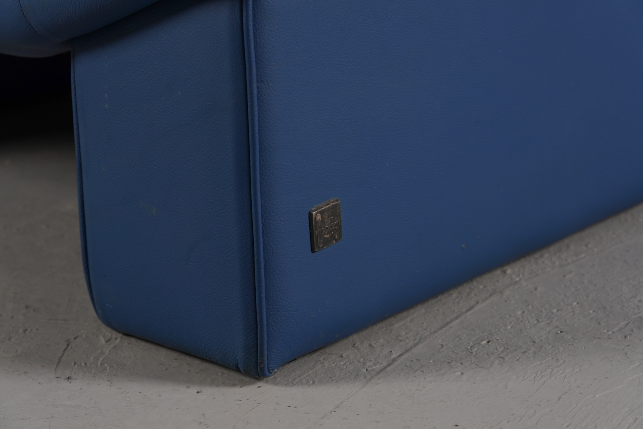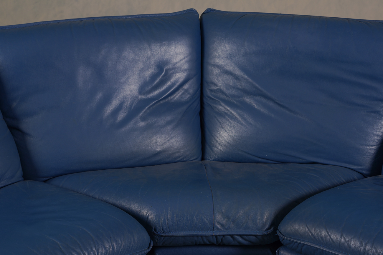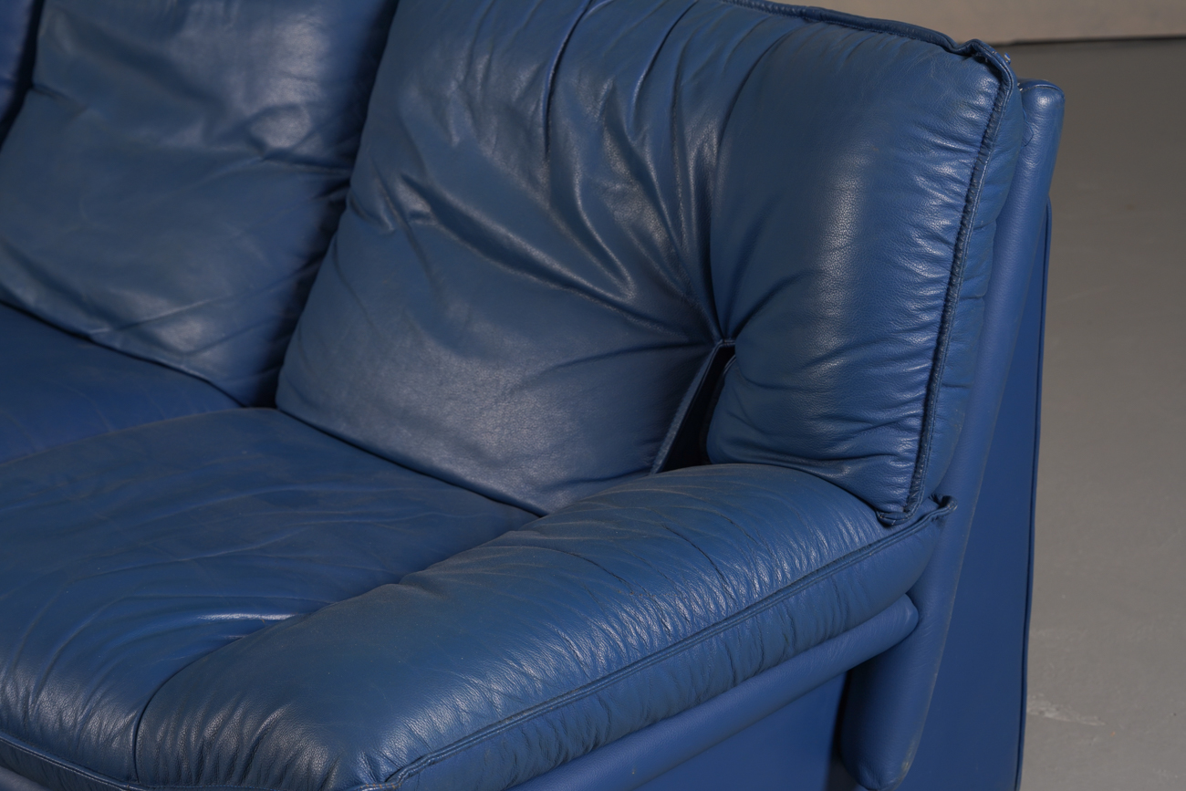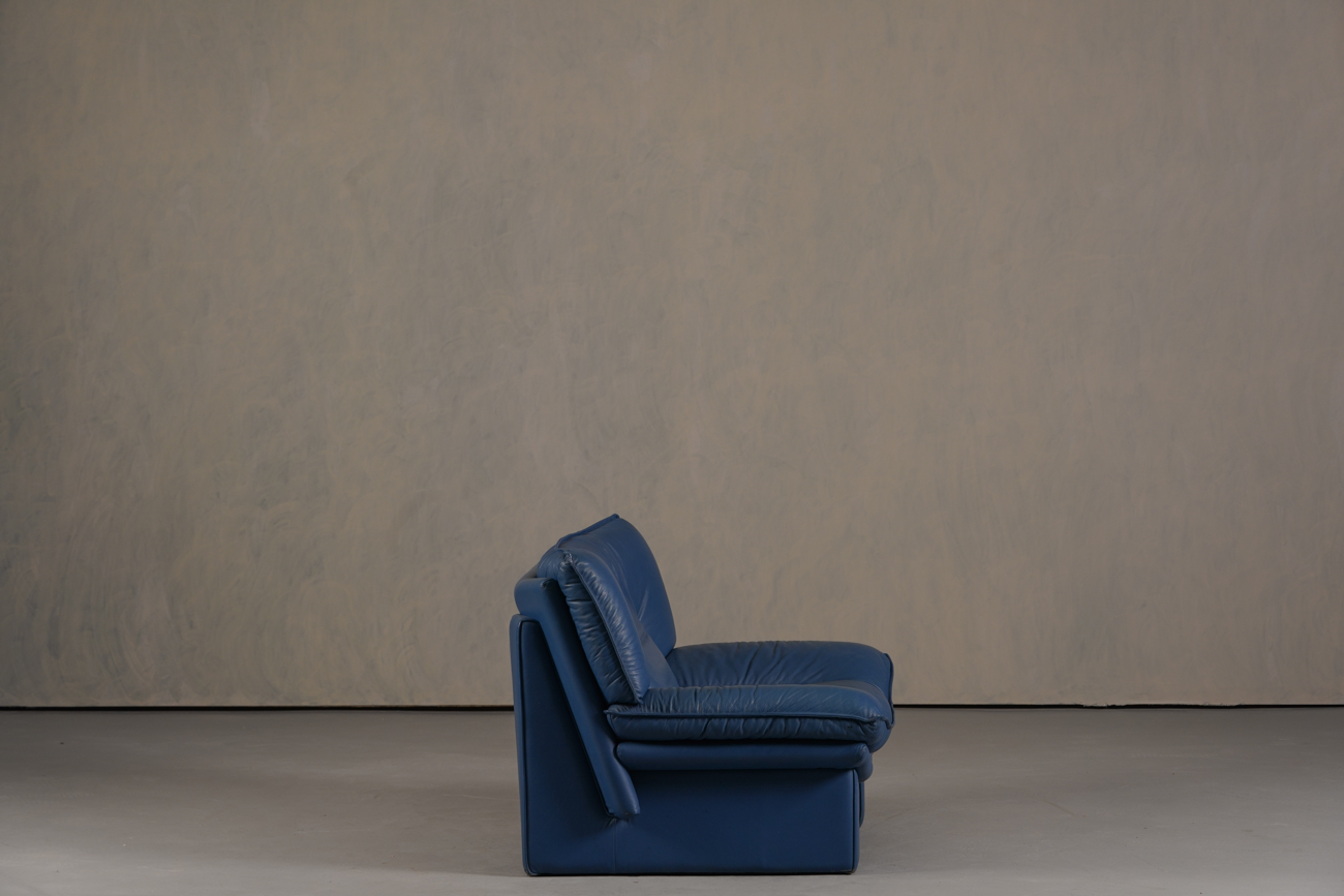 The set features a blue leather sofa and armchair, both offering wide, comfortable seating. Unique back supports and legs upholstered in thick, soft leather give the pieces character. Inspired by pop-art aesthetics, this set adds a sophisticated and lively presence to any interior.