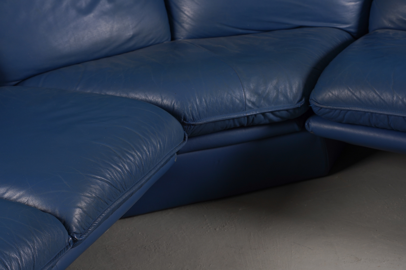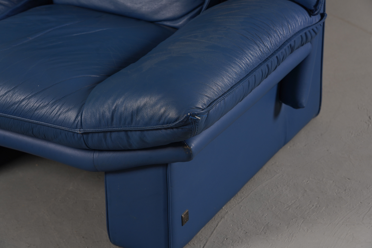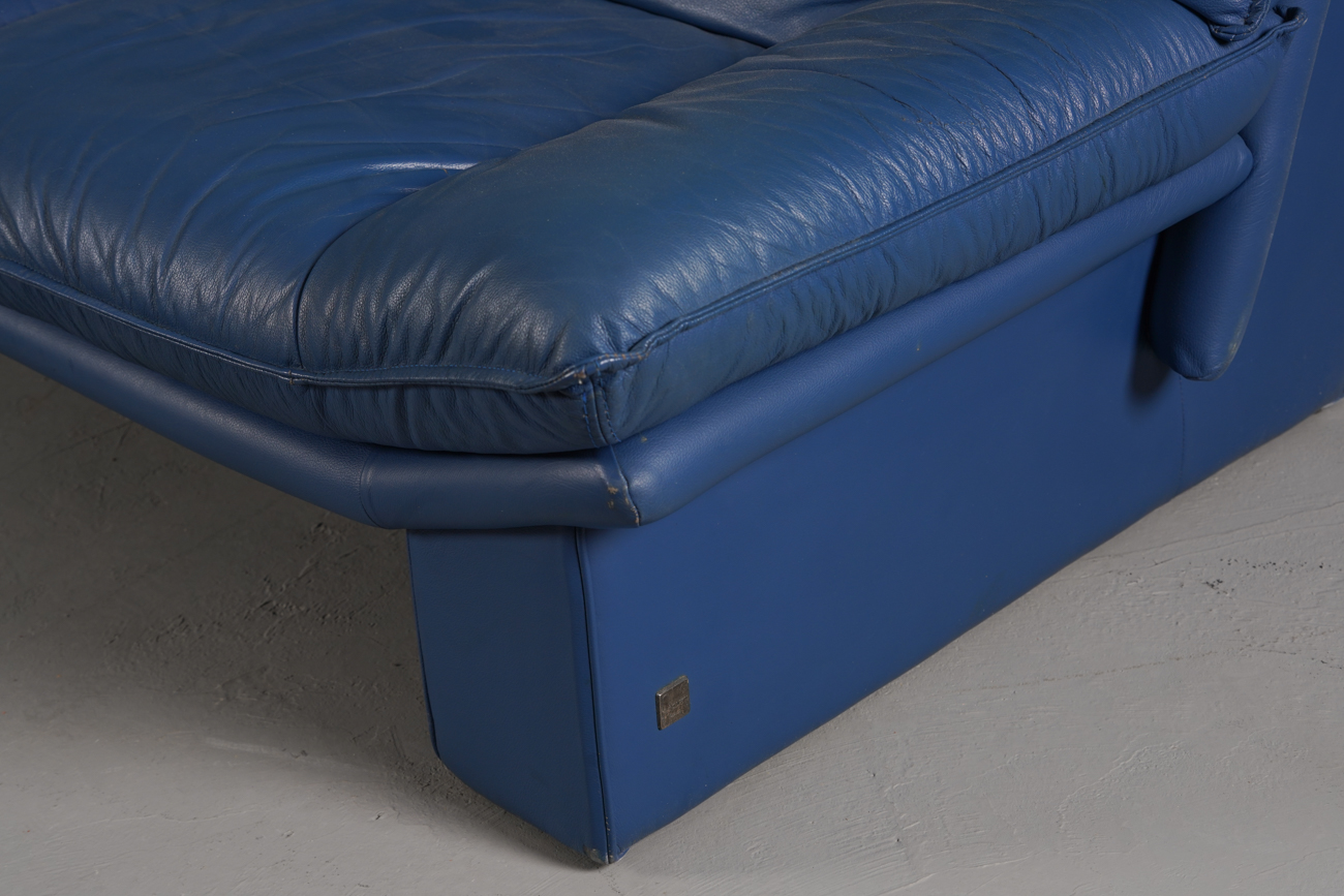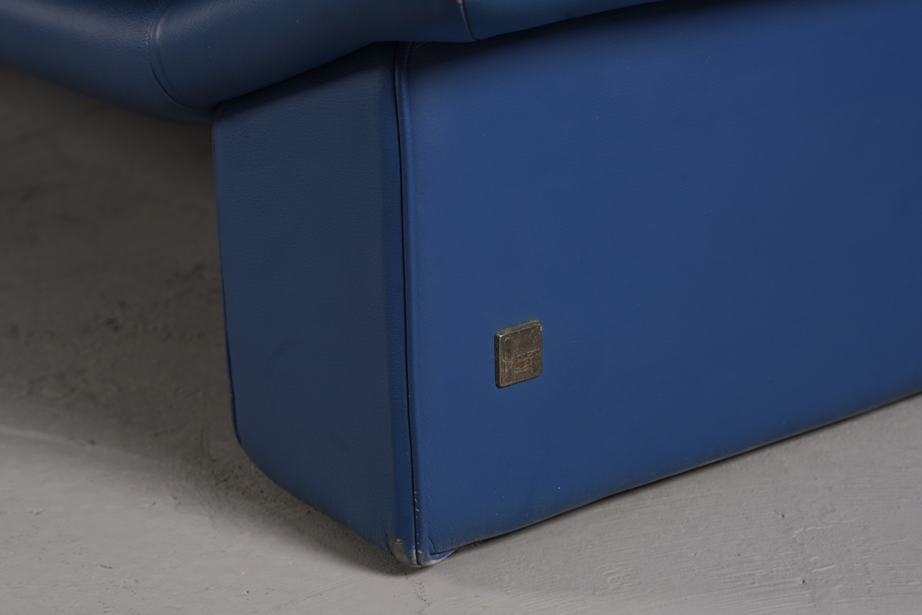 The set features a blue leather sofa and armchair, both offering wide, comfortable seating. Unique back supports and legs upholstered in thick, soft leather give the pieces character. Inspired by pop-art aesthetics, this set adds a sophisticated and lively presence to any interior.