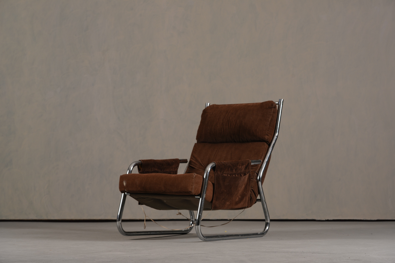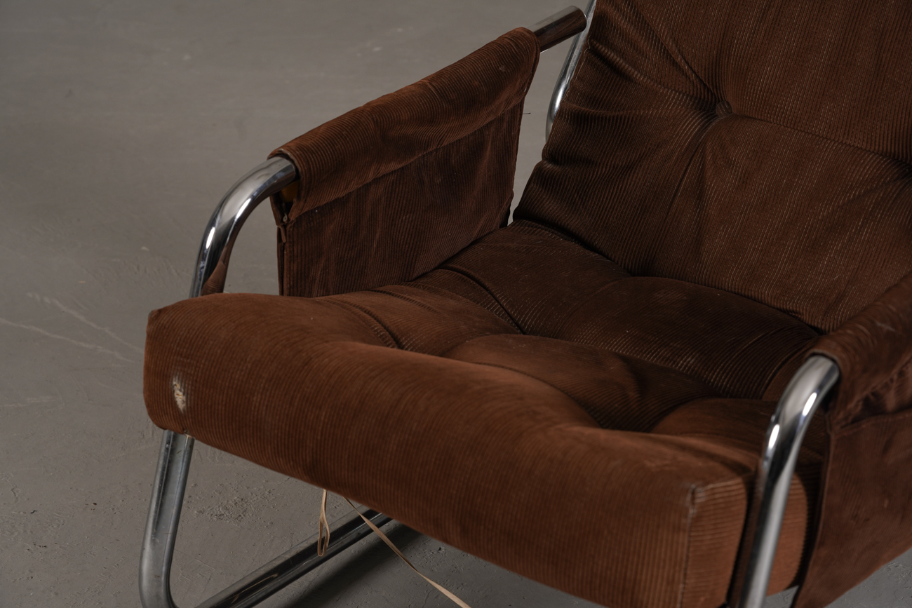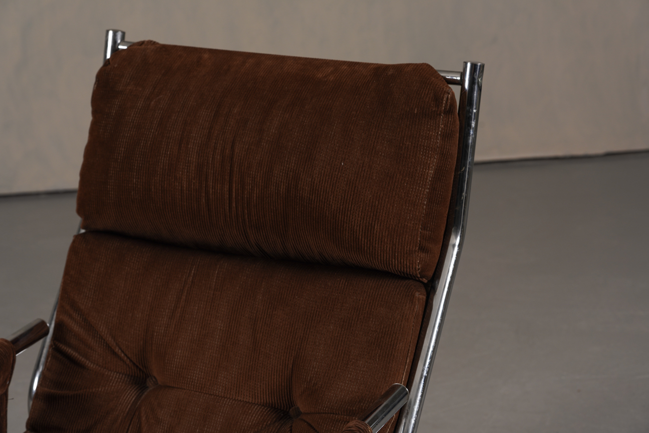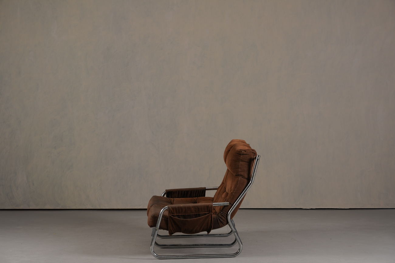 Exceptional and rare vintage scandinavian armchair by gillis lundgren, swedish designer for ikea in the 1970s, vintage dark brown velvet with large ribs. Tubular chrome metal structure, original velvet fabric for the seat and the 2 storage compartments.
