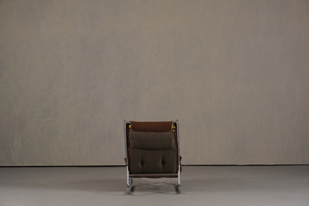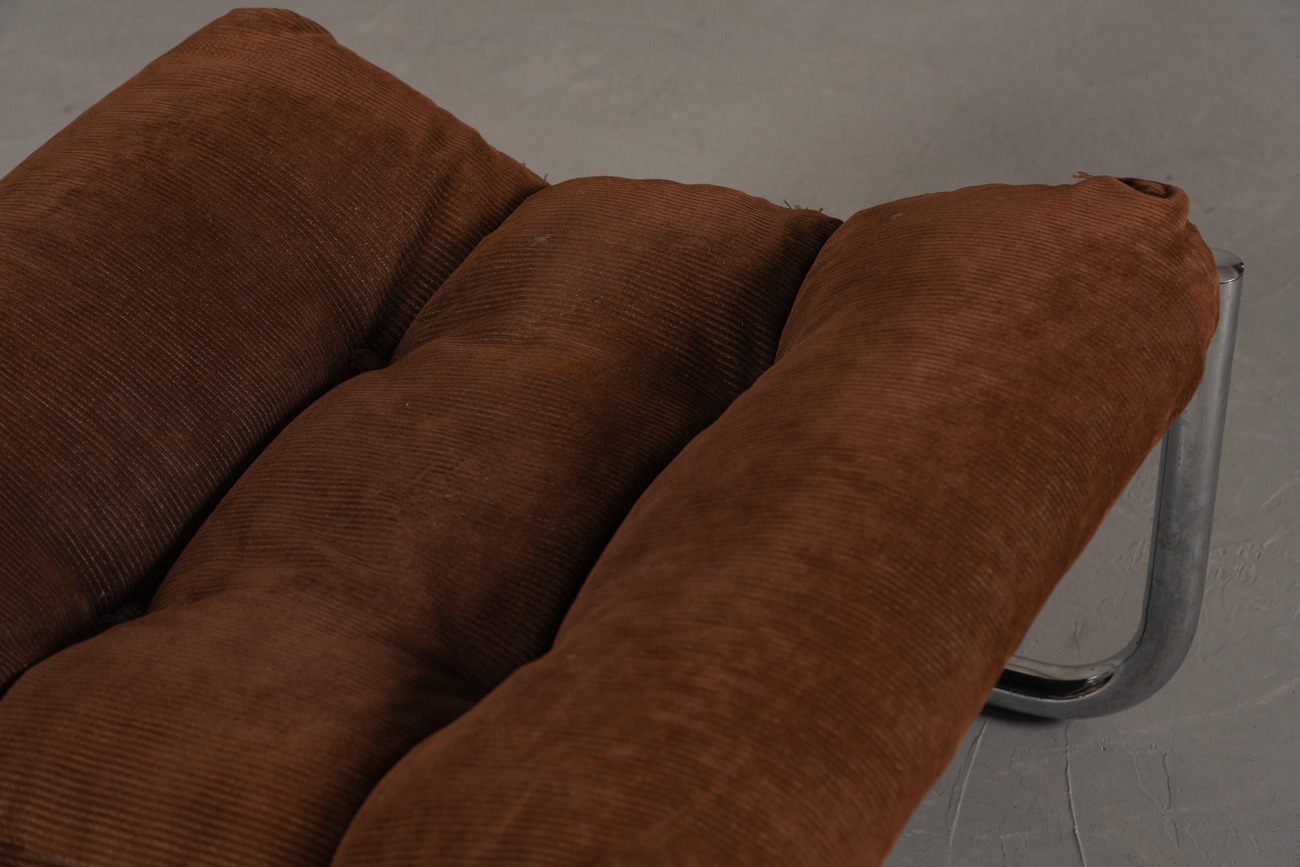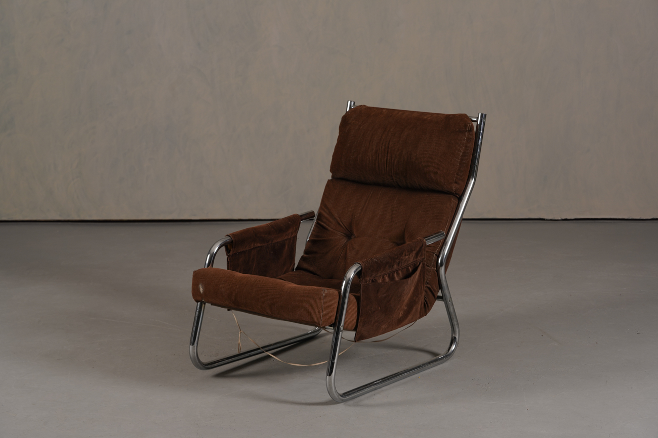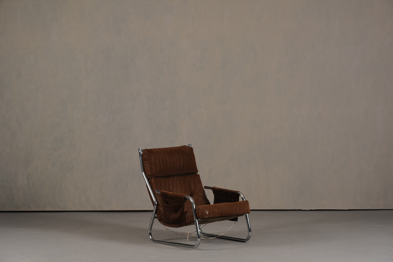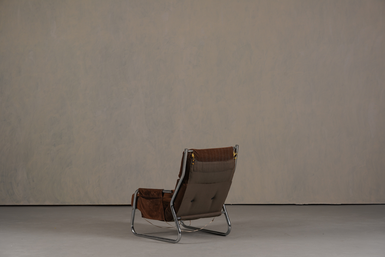 Exceptional and rare vintage scandinavian armchair by gillis lundgren, swedish designer for ikea in the 1970s, vintage dark brown velvet with large ribs. Tubular chrome metal structure, original velvet fabric for the seat and the 2 storage compartments.