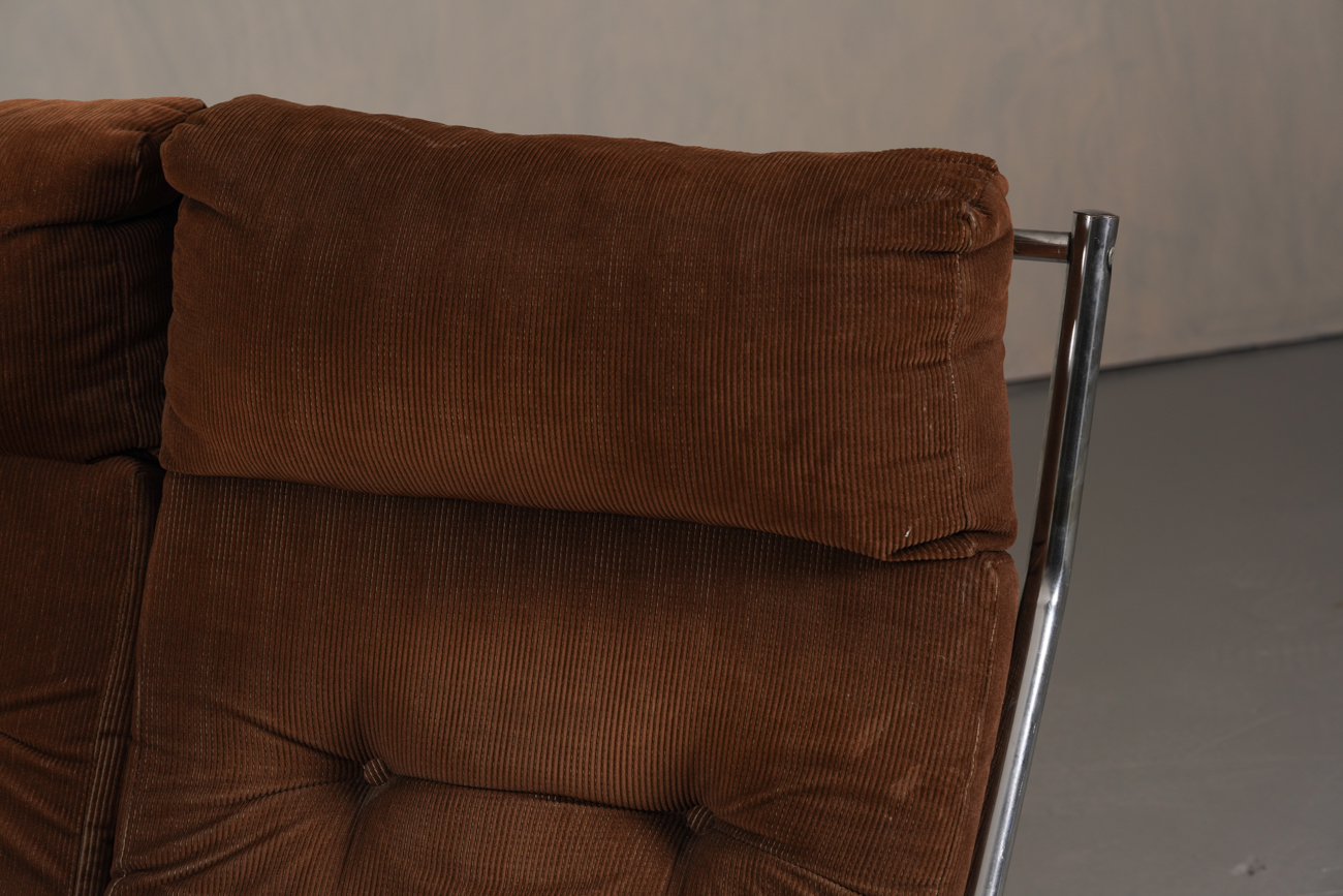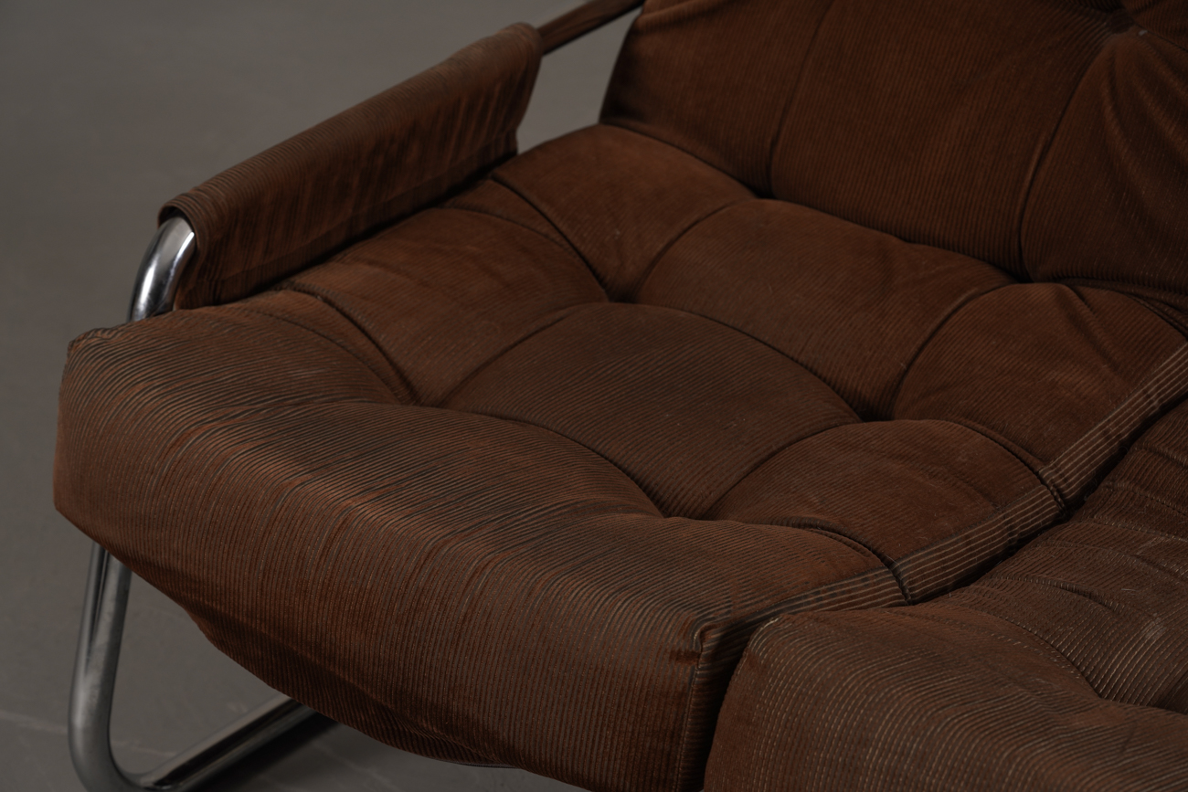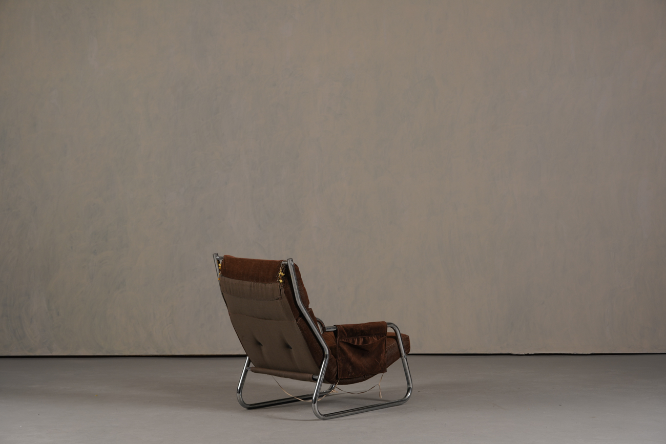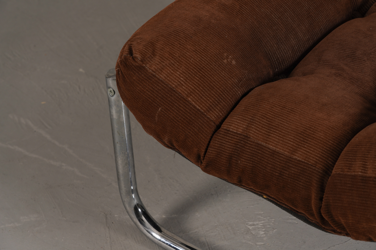 Exceptional and rare vintage scandinavian armchair by gillis lundgren, swedish designer for ikea in the 1970s, vintage dark brown velvet with large ribs. Tubular chrome metal structure, original velvet fabric for the seat and the 2 storage compartments.