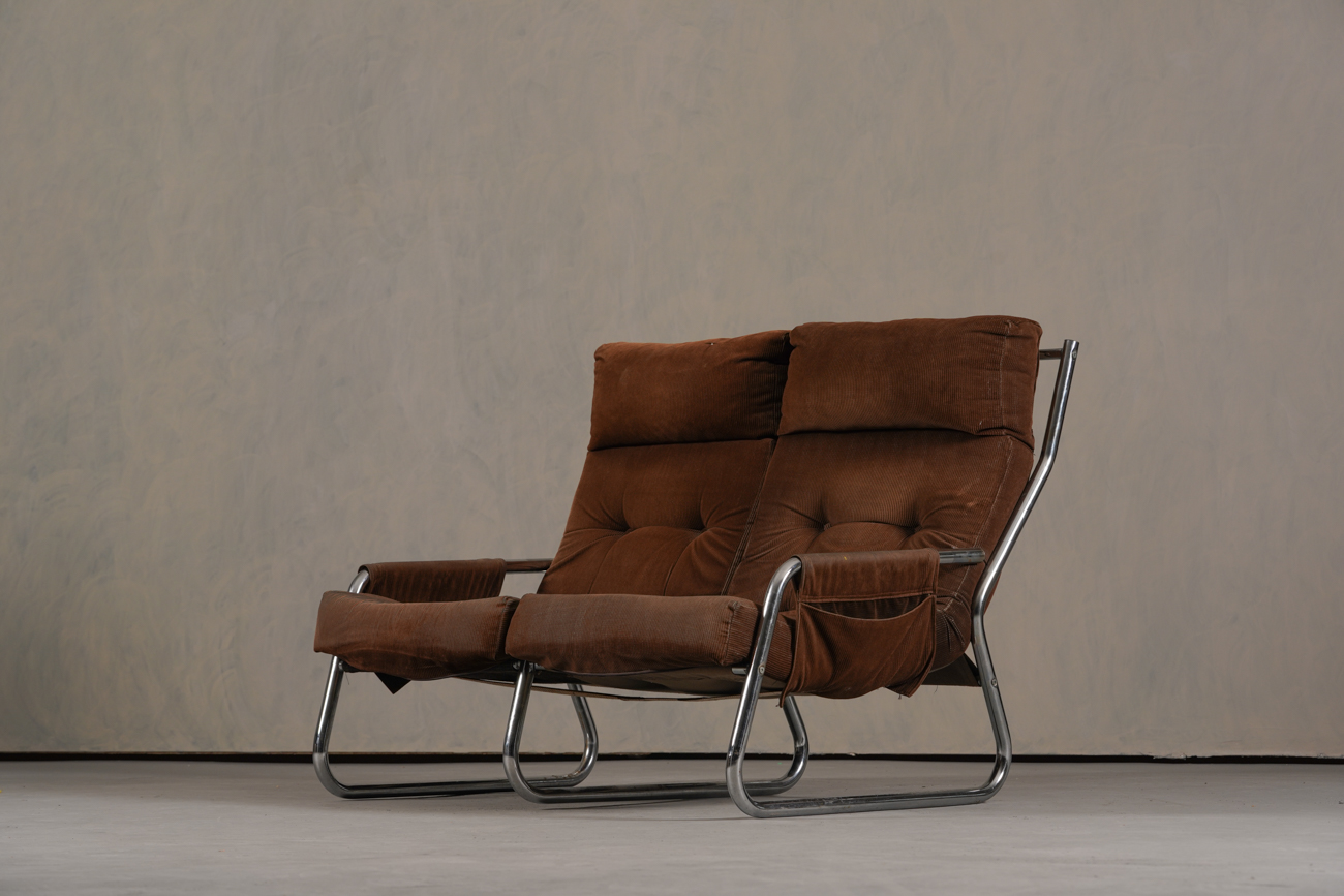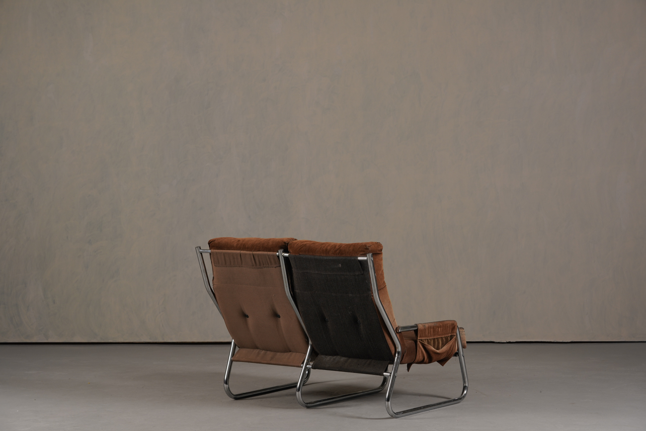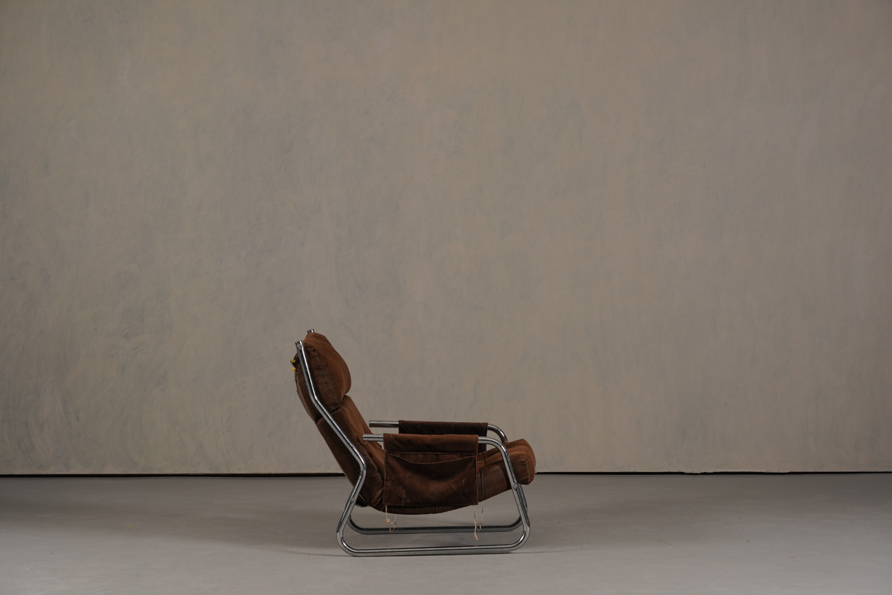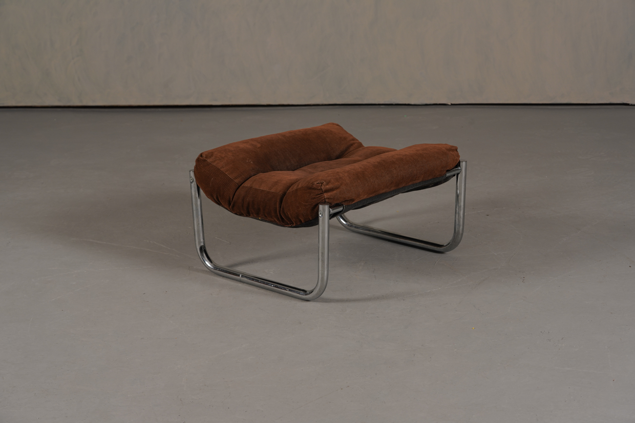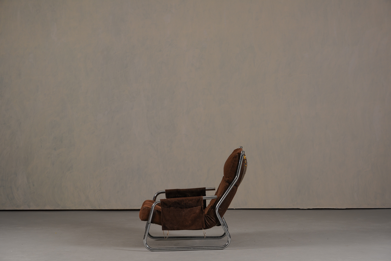 Exceptional and rare vintage scandinavian armchair by gillis lundgren, swedish designer for ikea in the 1970s, vintage dark brown velvet with large ribs. Tubular chrome metal structure, original velvet fabric for the seat and the 2 storage compartments.