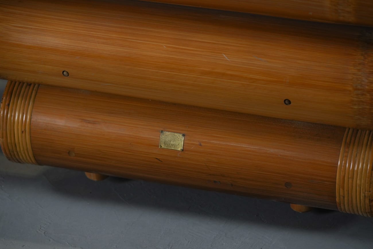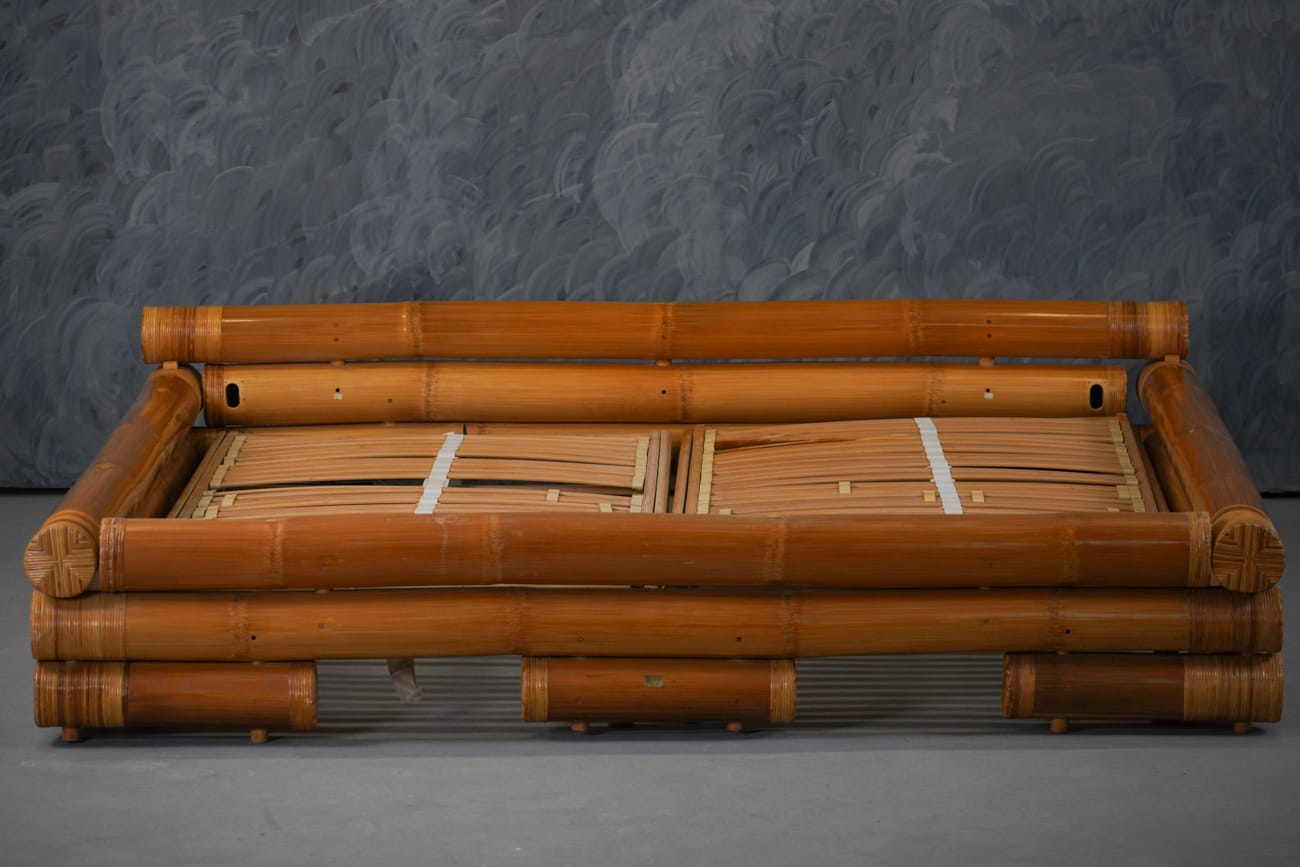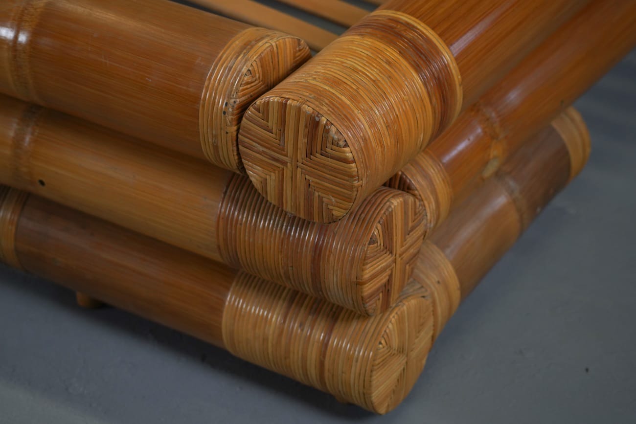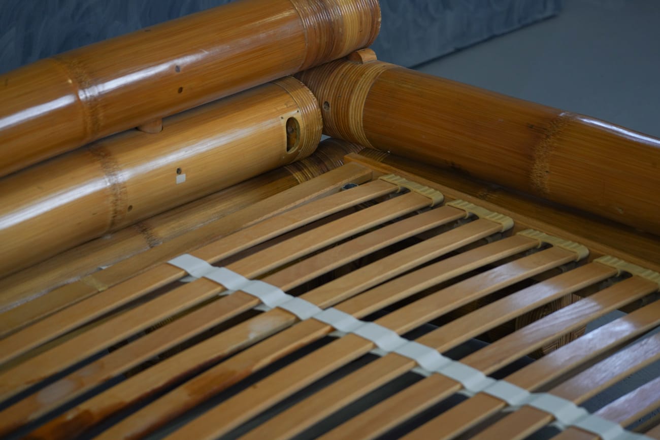 A large vintage bamboo bed frame from Thailand, dating to the 1990s. Crafted entirely from bamboo, this king-size bed reflects traditional Asian craftsmanship combined with a simple, functional design.