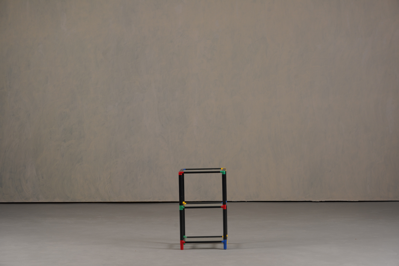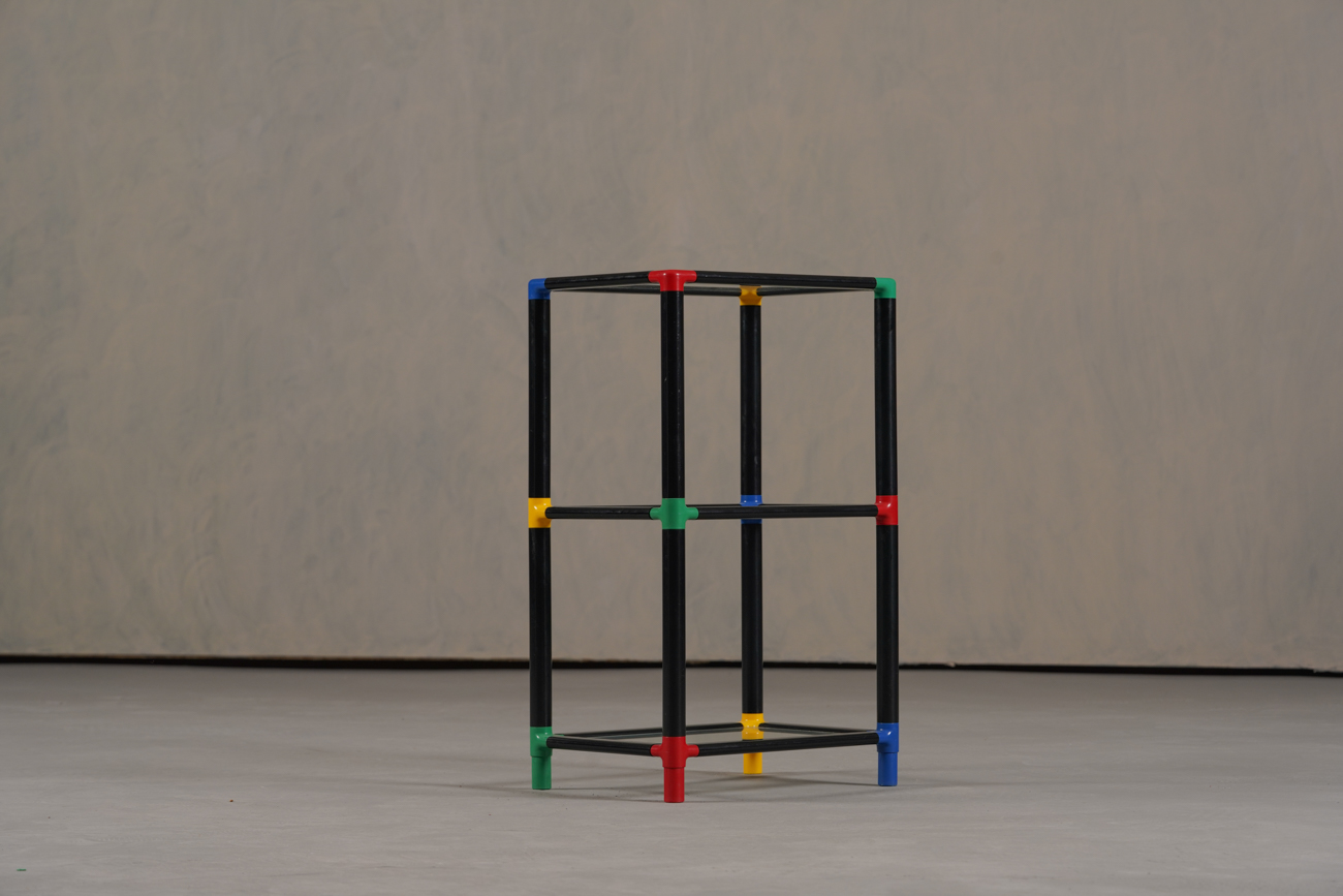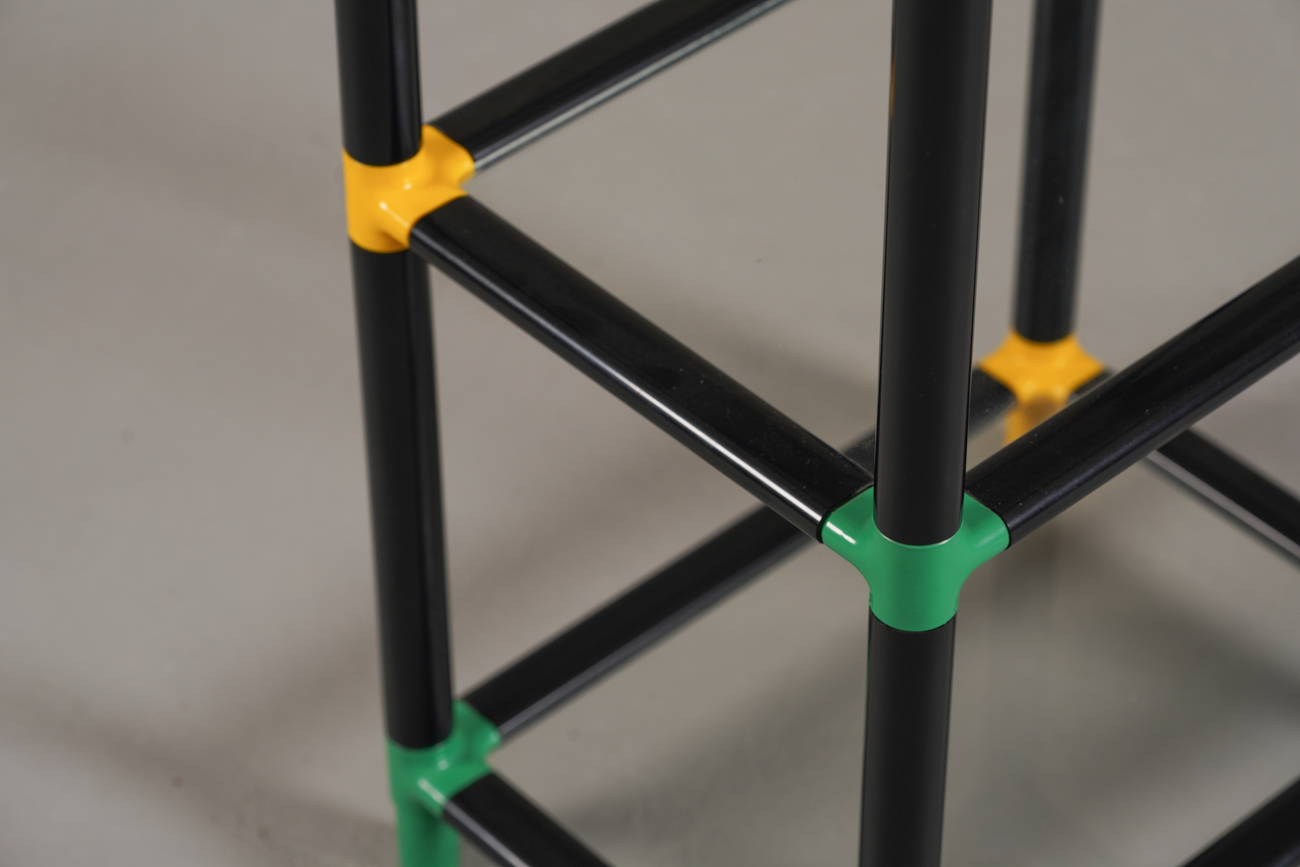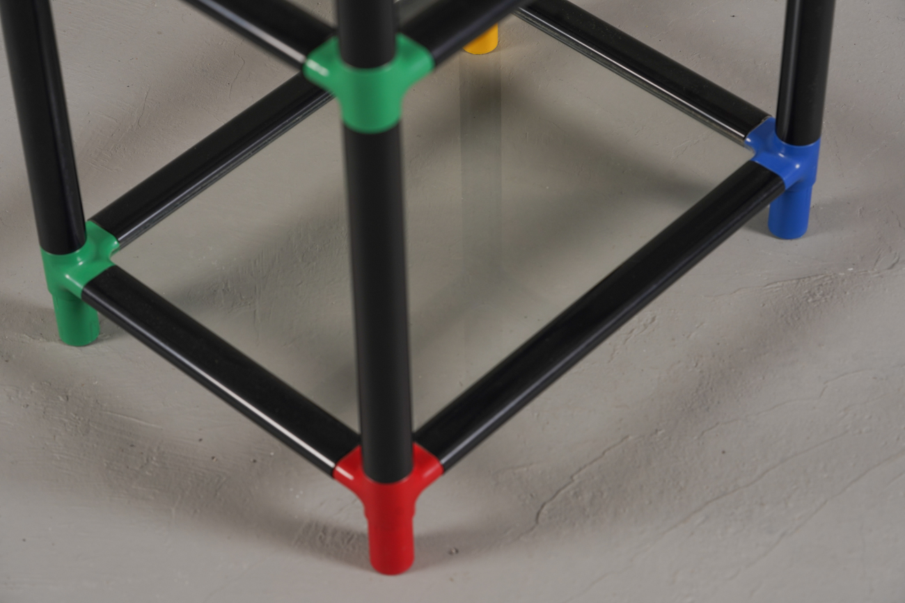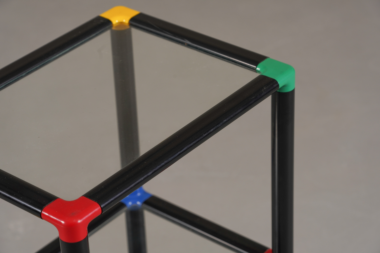Memphis-style display cabinet with glass and multicolored edges — available now from Retros Gallery.