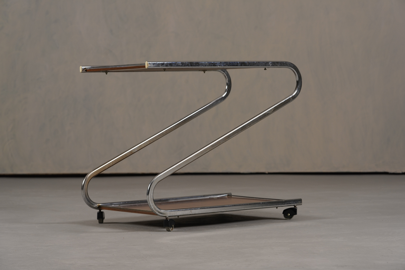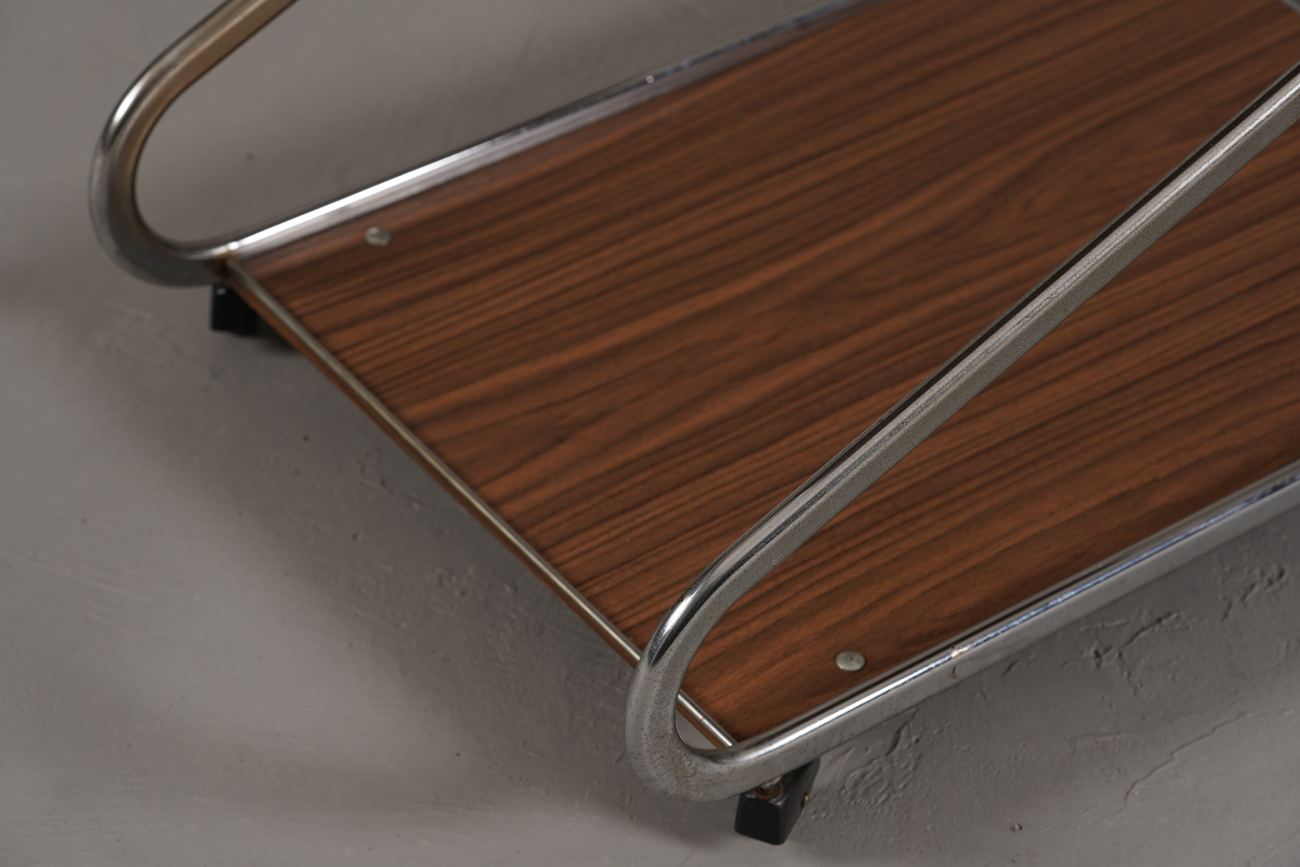 A stylish and functional vintage bar cart from Germany, combining lightweight aluminium and walnut-look plywood — available now from Retros Gallery.