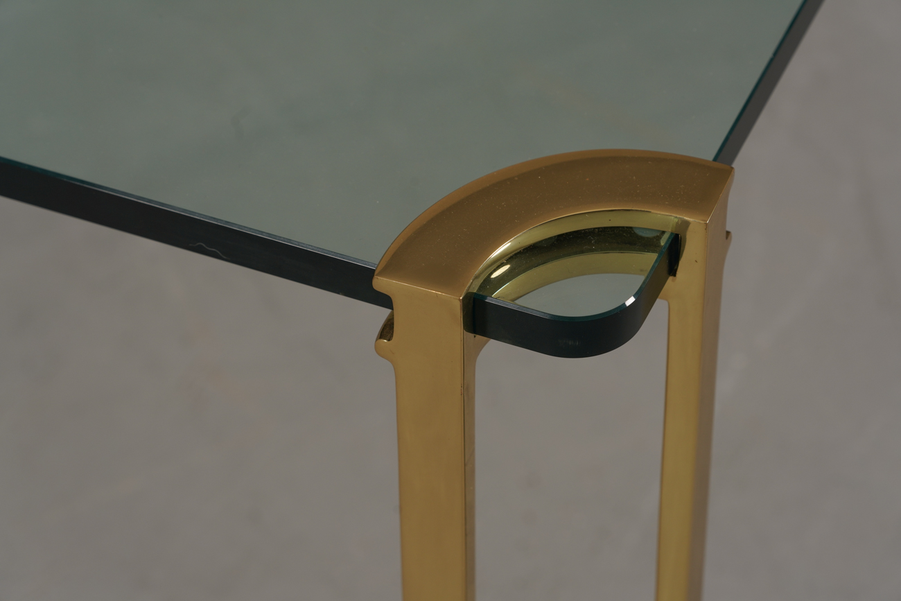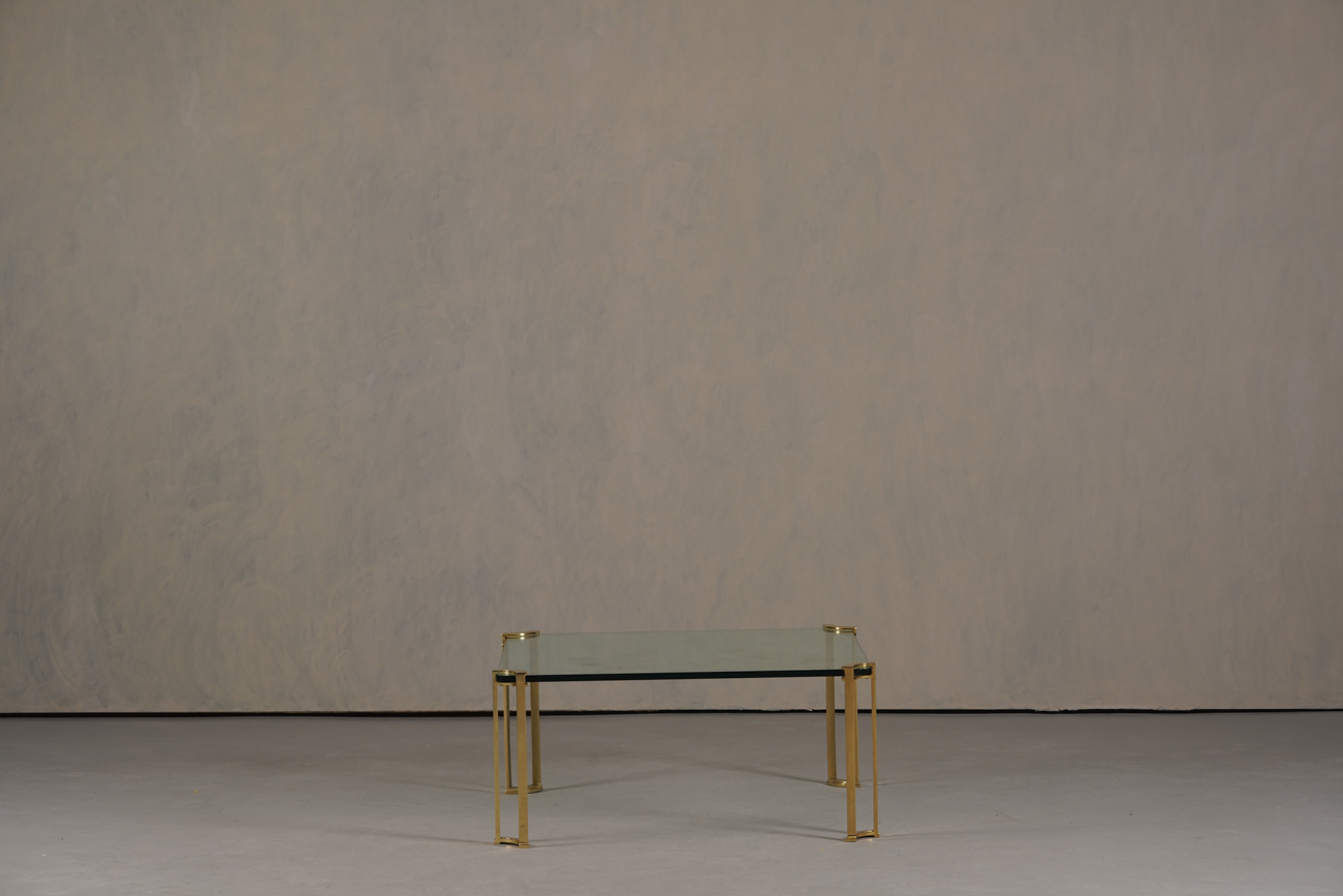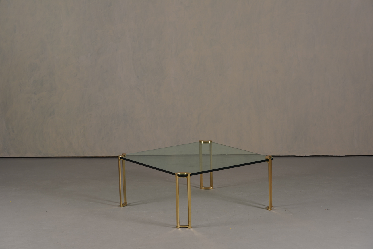 A rare vintage bronze and glass coffee table by Peter Ghyczy, combining solid brass legs with a thick glass top — available now from Retros Gallery.