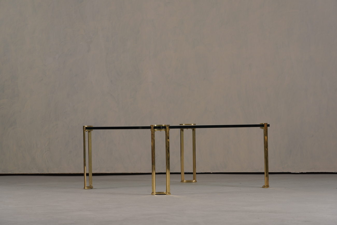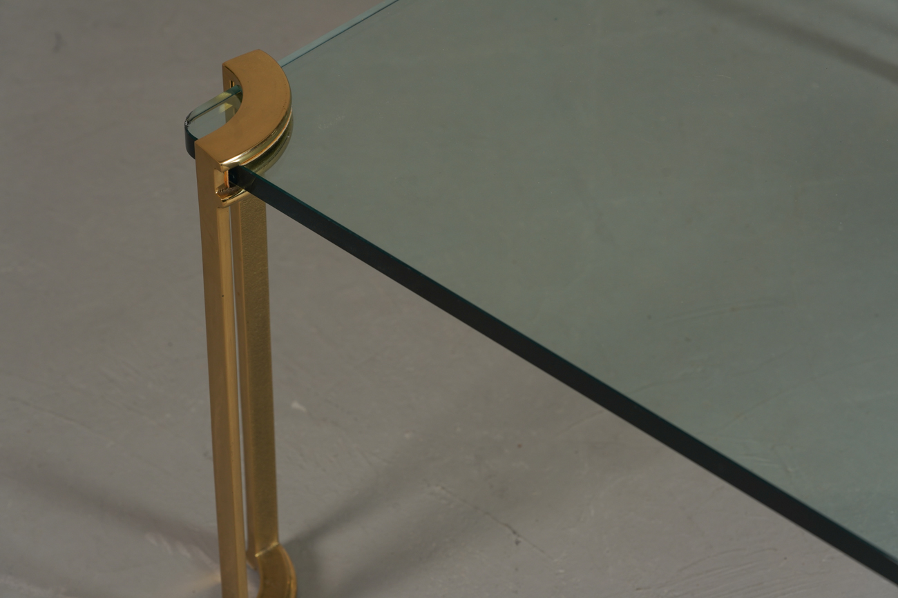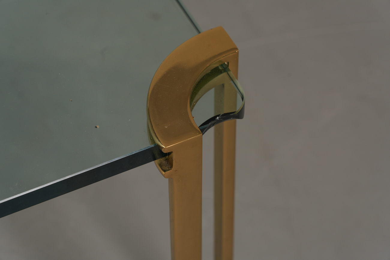 A rare vintage bronze and glass coffee table by Peter Ghyczy, combining solid brass legs with a thick glass top — available now from Retros Gallery.
