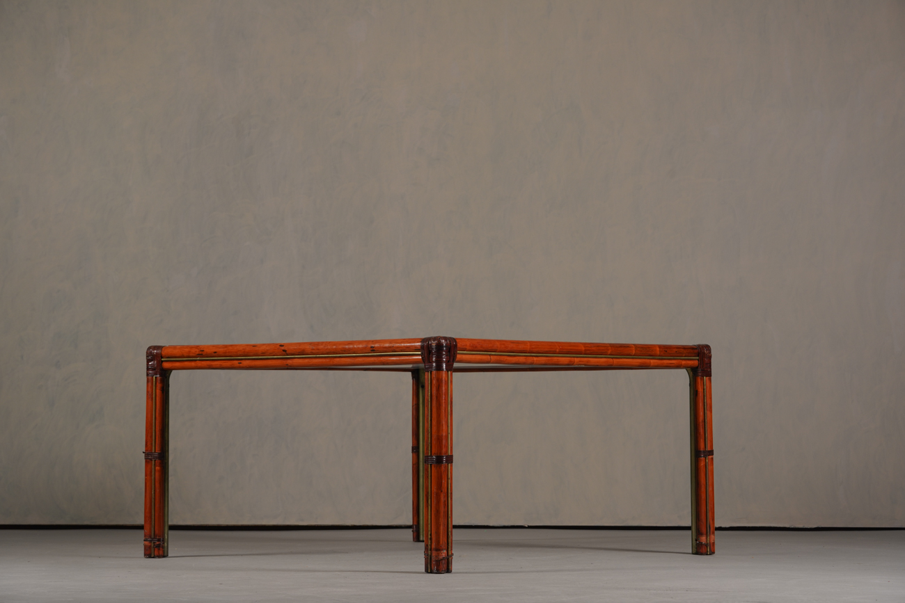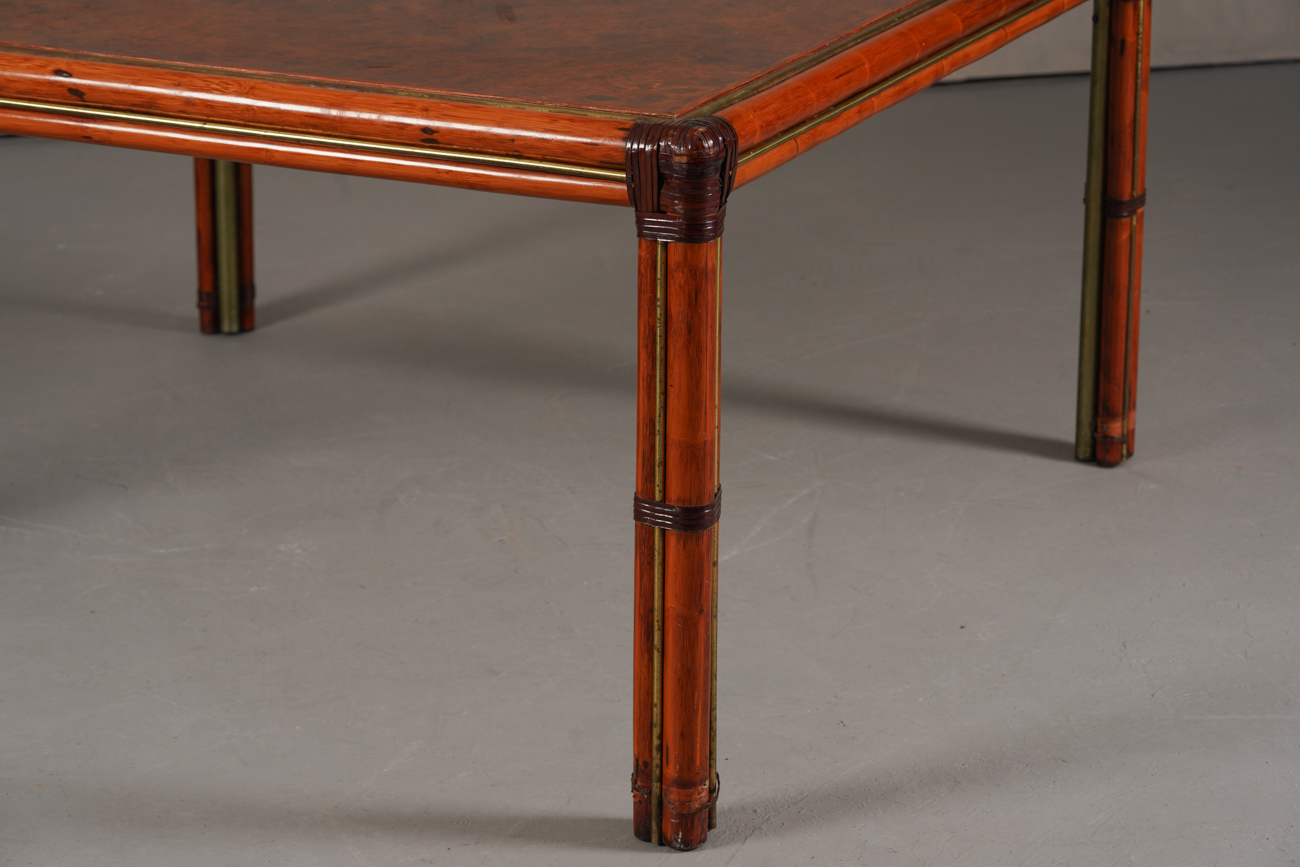 A vintage Italian dining table designed by Alberto Smania for Studio Smania Interni in the 1960’s. This square burl elm table features leather-woven corners, brass trim, and Italian cane detailing, showcasing the quality of mid-century Italian design. Ideal as a dining table, modern interior centerpiece, or collectible Italian furniture piece.