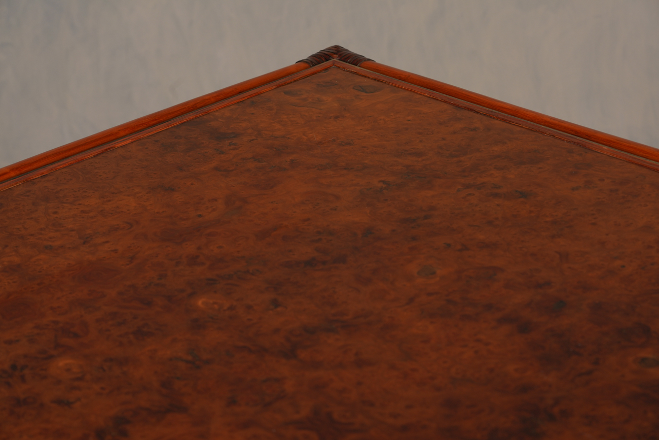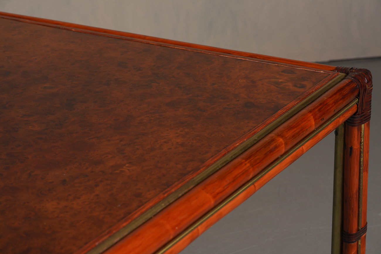 A rare Italian dining table by Alberto Smania — burl elm, brass, and cane details — available now from Retros Gallery.