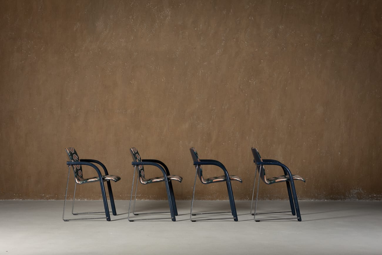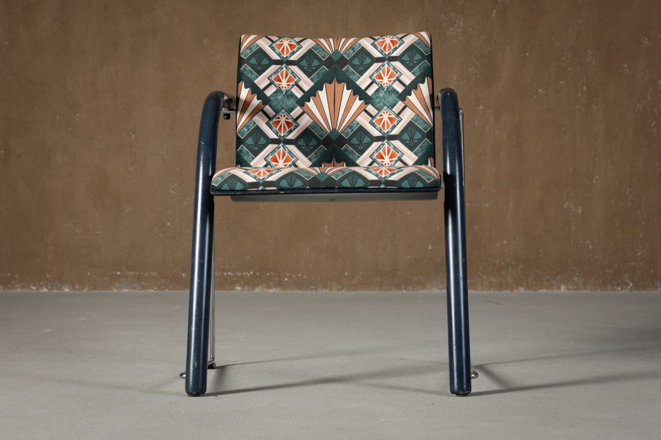 Fotoliu Vintage A 320 în tapițat în catifea Eltham Palace — o piesă emblematică a designului german de la sfârșitul secolului XX. Creat de Wulf Schneider și Ulrich Boehme pentru Thonet, acest fotoliu combină eleganța sculpturală cu funcționalitatea ergonomică. Structura din placaj curbat de fag se îmbină armonios cu brațele curbate din lemn, iar bara cromată adaugă stabilitate și echilibru vizual.