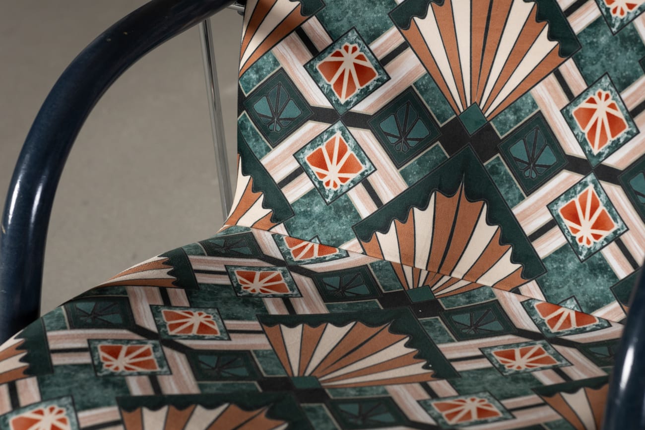 Inspired by the geometries of British architecture, the Eltham Palace pattern enhances the armchair’s sculptural elegance, bringing out a unique visual depth. With tones of warm wood and stone, it adds an extra layer of texture and sophistication to any space.